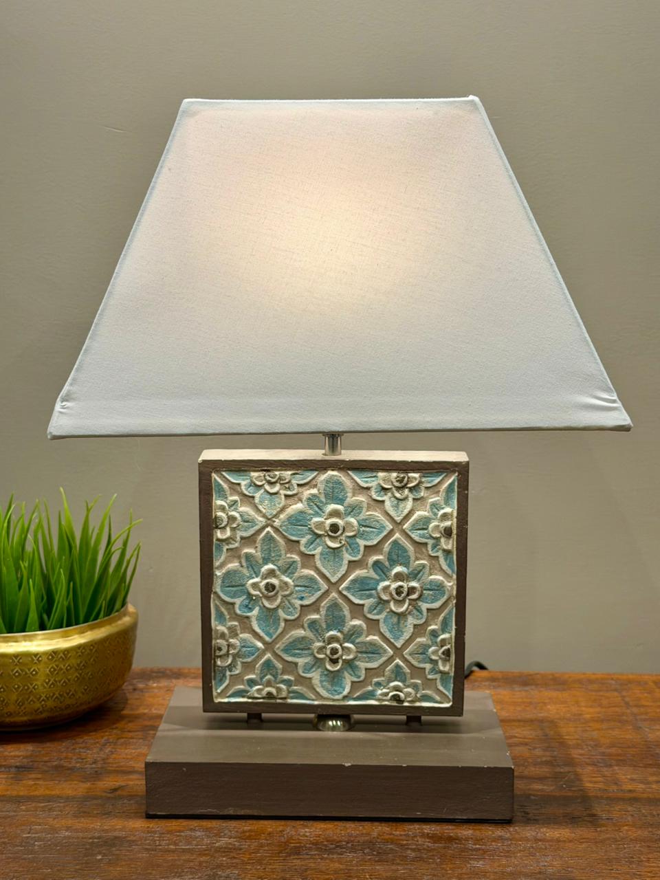 Abajur Flor - Madeira - Com Base - Marrom e Azul - Com Cúpula
