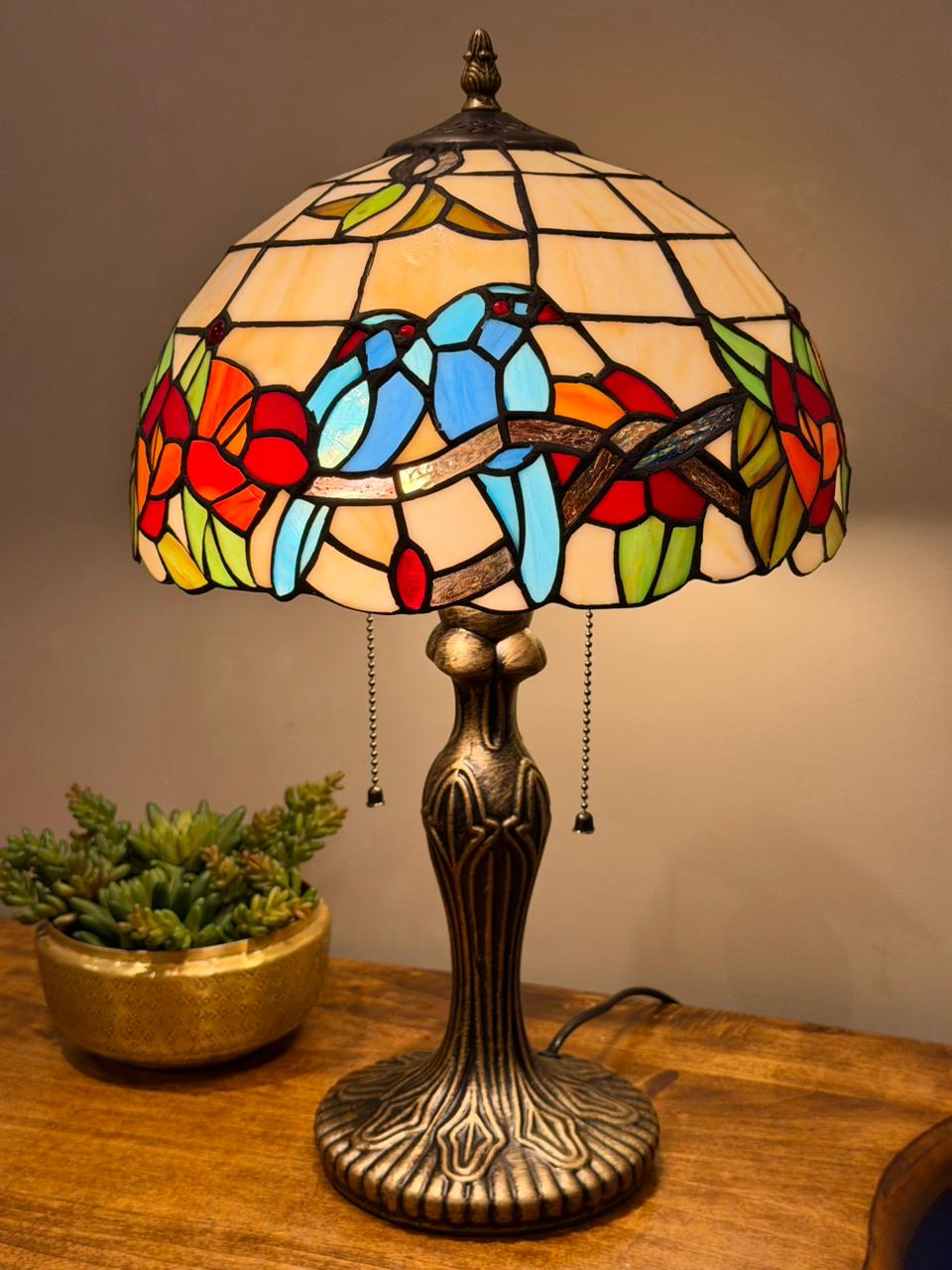 Cada detalhe do vitral ganha vida quando iluminado, tornando o abajur não apenas funcional, mas também um verdadeiro destaque na decoração.