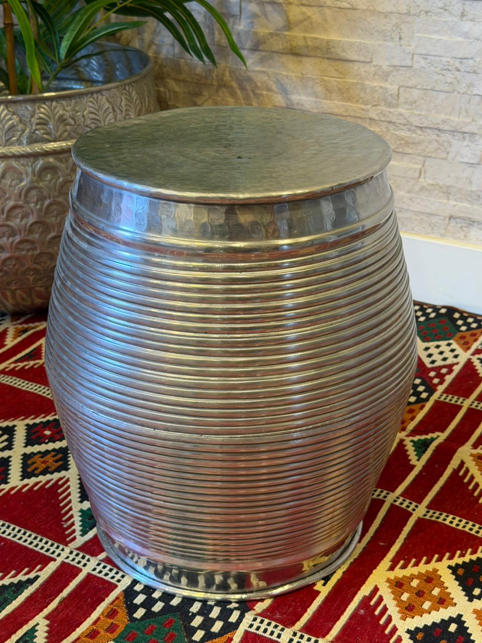Versátil e elegante, pode ser utilizado como banquinho, mesa lateral, apoio decorativo em ambientes internos ou externos cobertos. O alumínio garante leveza, resistência e durabilidade, enquanto o processo artesanal torna cada peça exclusiva, com pequenas variações que reforçam sua autenticidade.