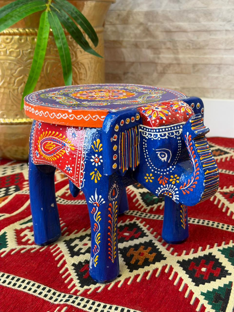 Banqueta artesanal em formato de elefante, produzida na Índia e pintada à mão com cores vibrantes. Cada detalhe revela o cuidado do trabalho manual, desde os desenhos florais e geométricos até o acabamento delicado que valoriza a peça como um verdadeiro objeto de arte.