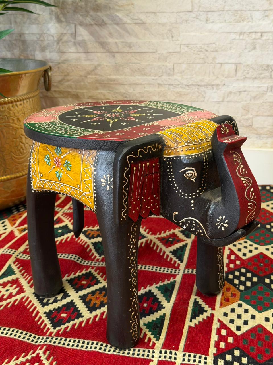 Banqueta artesanal em formato de elefante, produzida na Índia e pintada à mão com cores vibrantes. Cada detalhe revela o cuidado do trabalho manual, desde os desenhos florais e geométricos até o acabamento delicado que valoriza a peça como um verdadeiro objeto de arte.