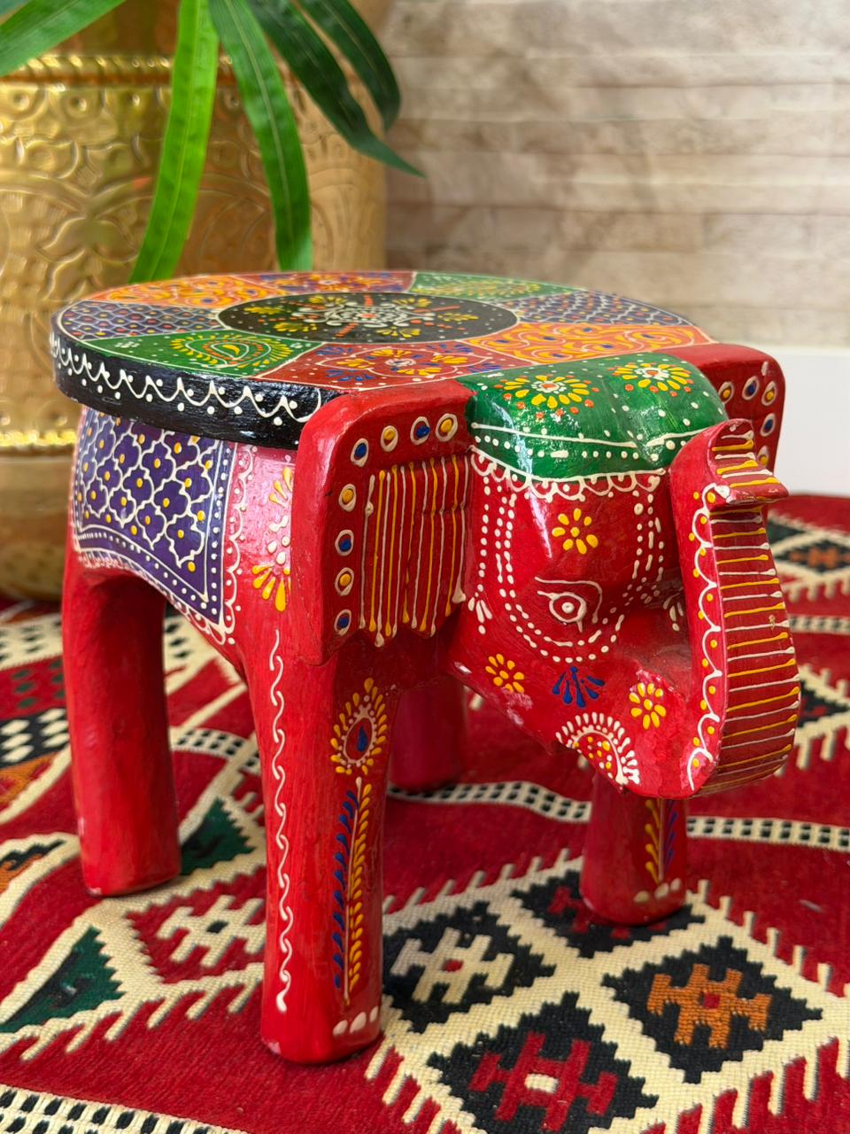 Banqueta artesanal em formato de elefante, produzida na Índia e pintada à mão com cores vibrantes. Cada detalhe revela o cuidado do trabalho manual, desde os desenhos florais e geométricos até o acabamento delicado que valoriza a peça como um verdadeiro objeto de arte.