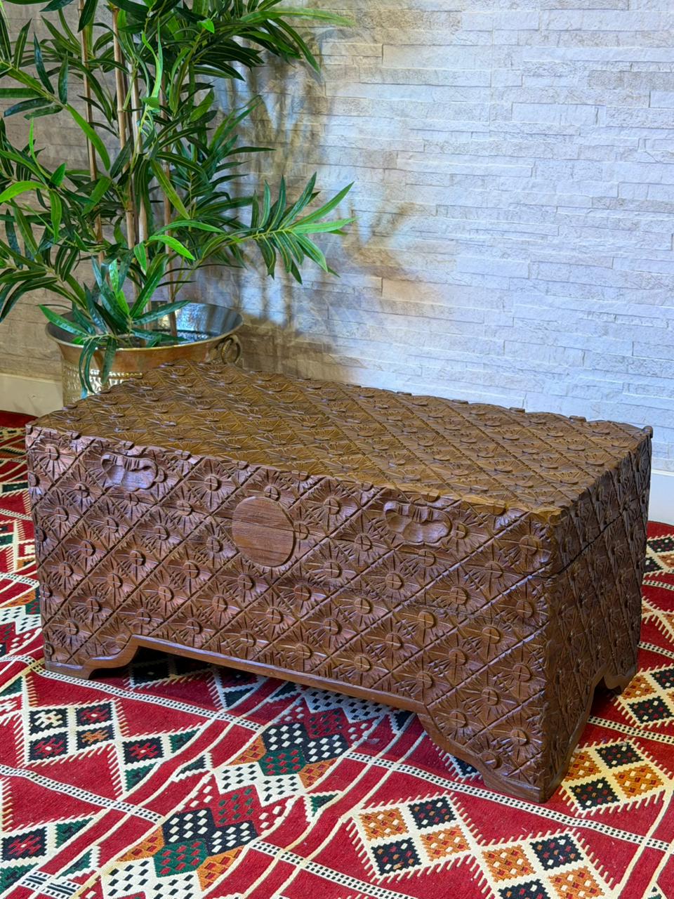 Encanto para quem ama decoração com alma. Este baú Indiano é inteiramente trabalhado em madeira e recebe delicados desenhos pintados à mão, trazendo o charme e a autenticidade do artesanato.