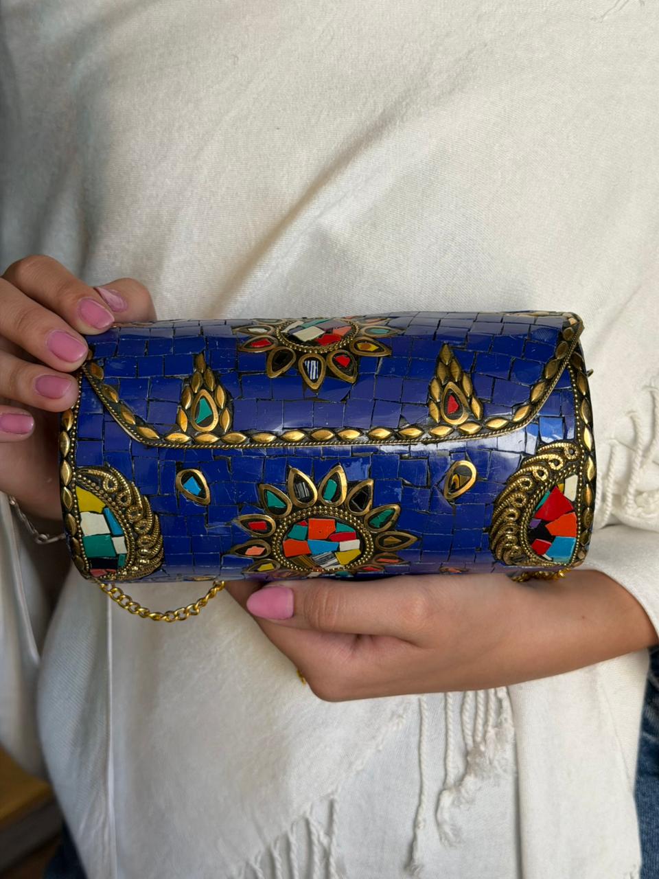 Bolsa Clutch em Metal - Azul, Colorido e Dourado - Com Alça