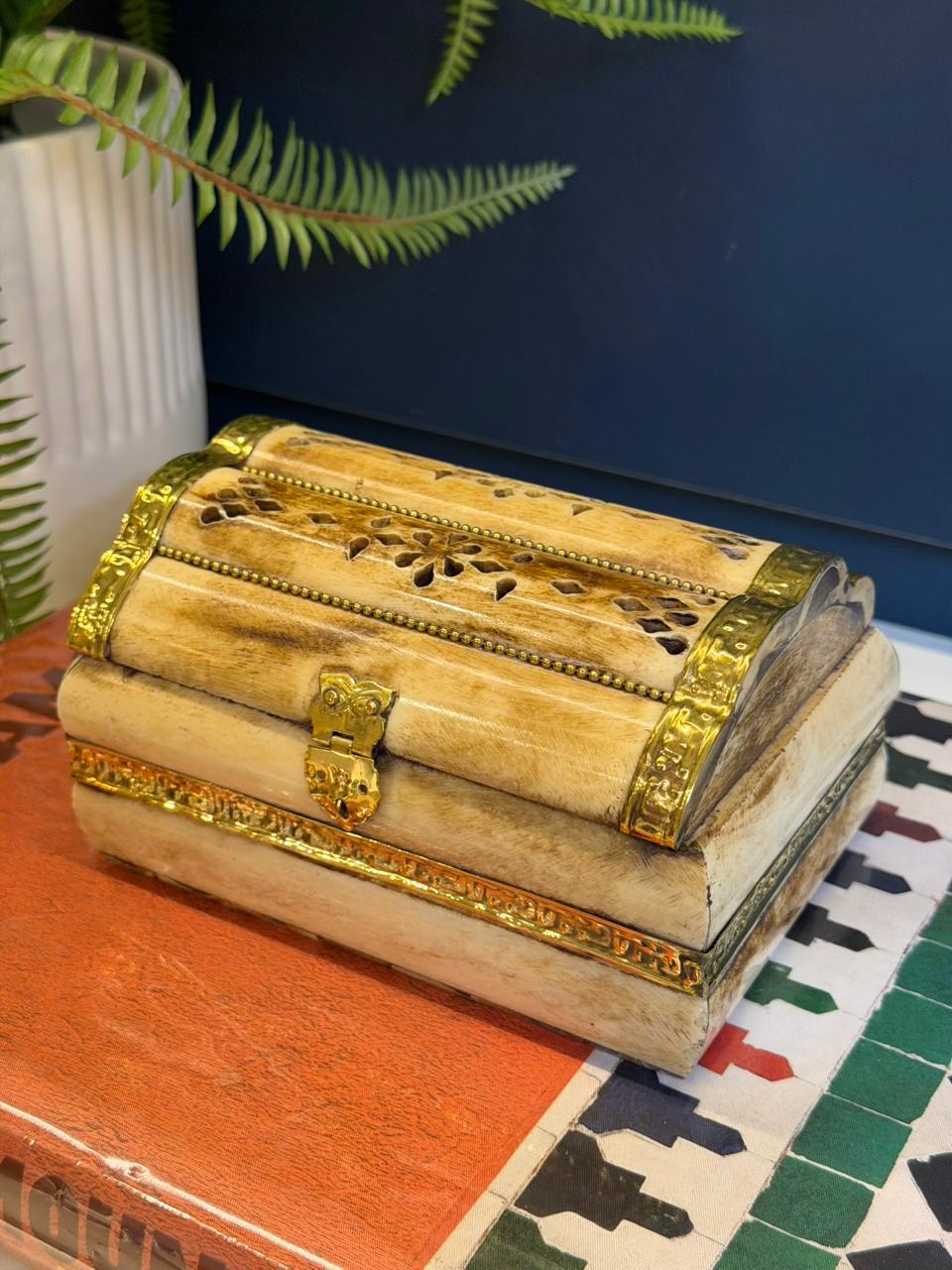 Esta caixa decorativa é uma peça produzida manualmente em osso, apresenta um padrão geométrico que traz sofisticação e personalidade à decoração.