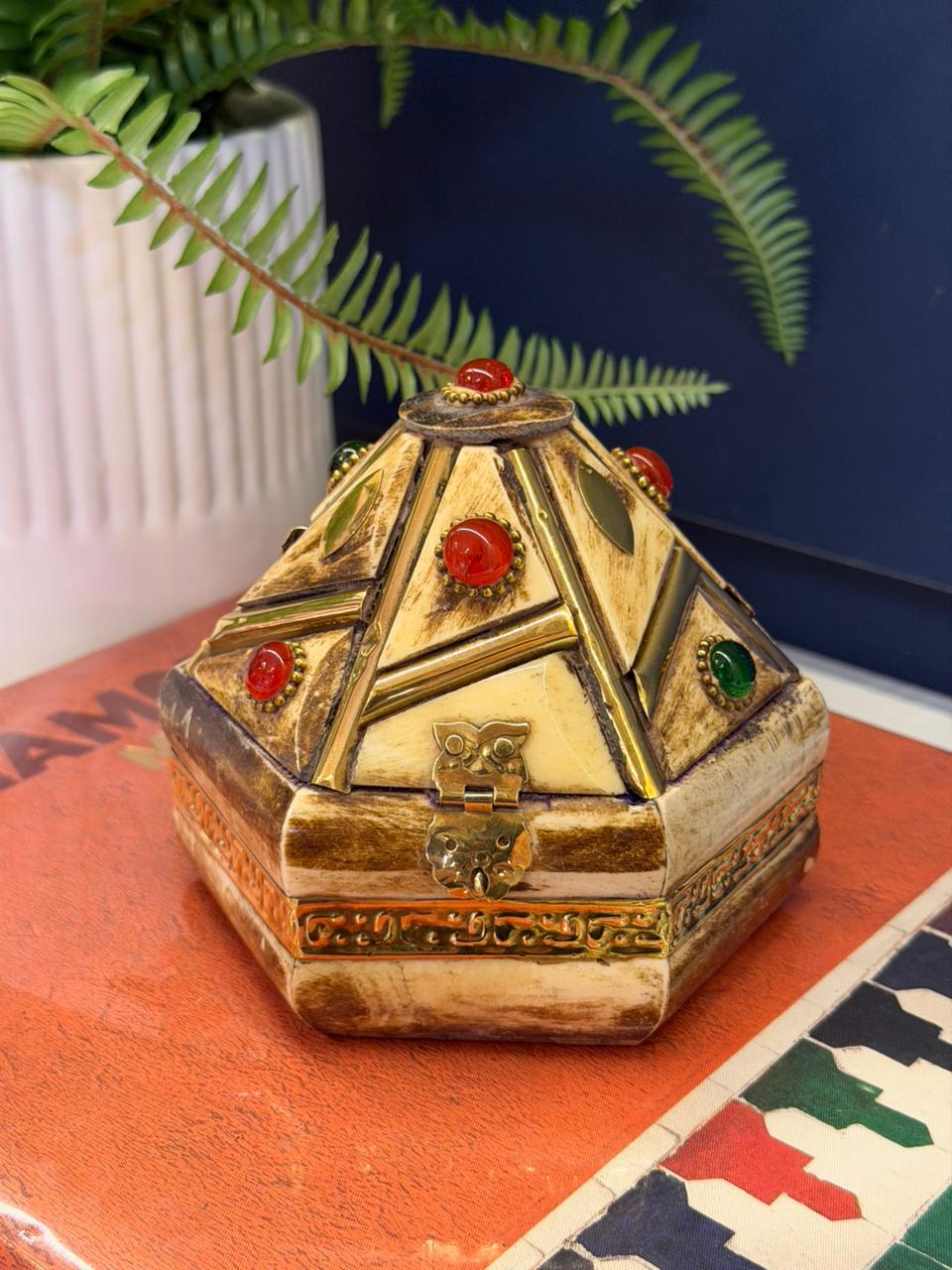 Esta caixa decorativa é uma peça produzida manualmente em osso, apresenta um padrão geométrico que traz sofisticação e personalidade à decoração.
