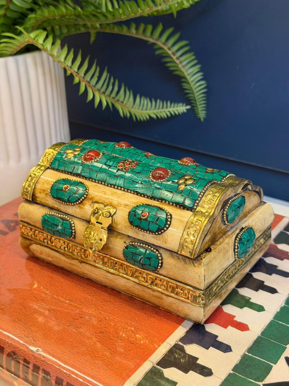 Esta caixa decorativa é uma peça produzida manualmente em osso, apresenta um padrão geométrico que traz sofisticação e personalidade à decoração.