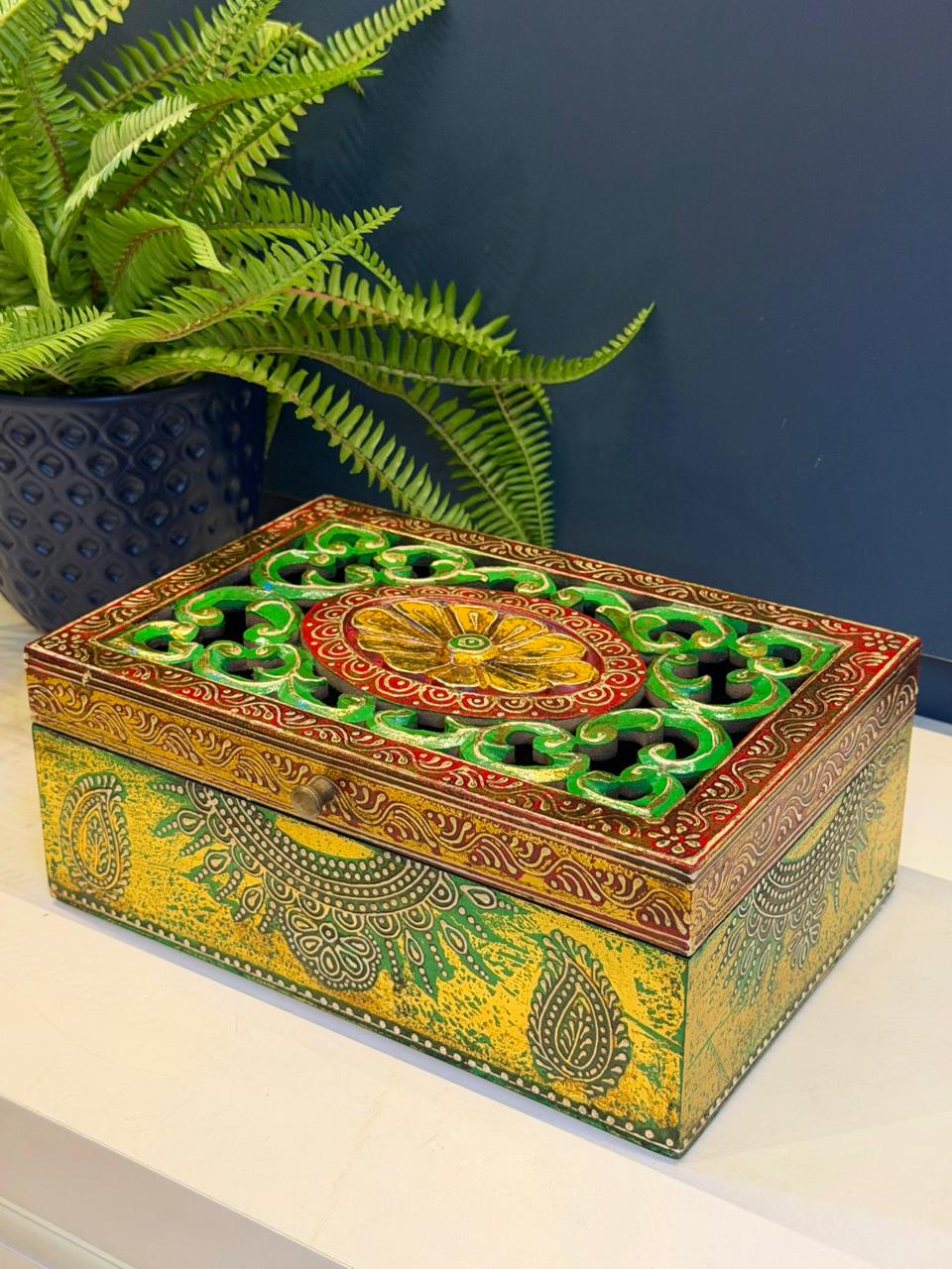 A caixa decorativa da Marrocos For You te ajudará a guardar seus itens mais preciosos. Feita de madeira e pintada a mão, é perfeita para guardar suas jóias, ou até mesmo como objeto de decoração da sala.
