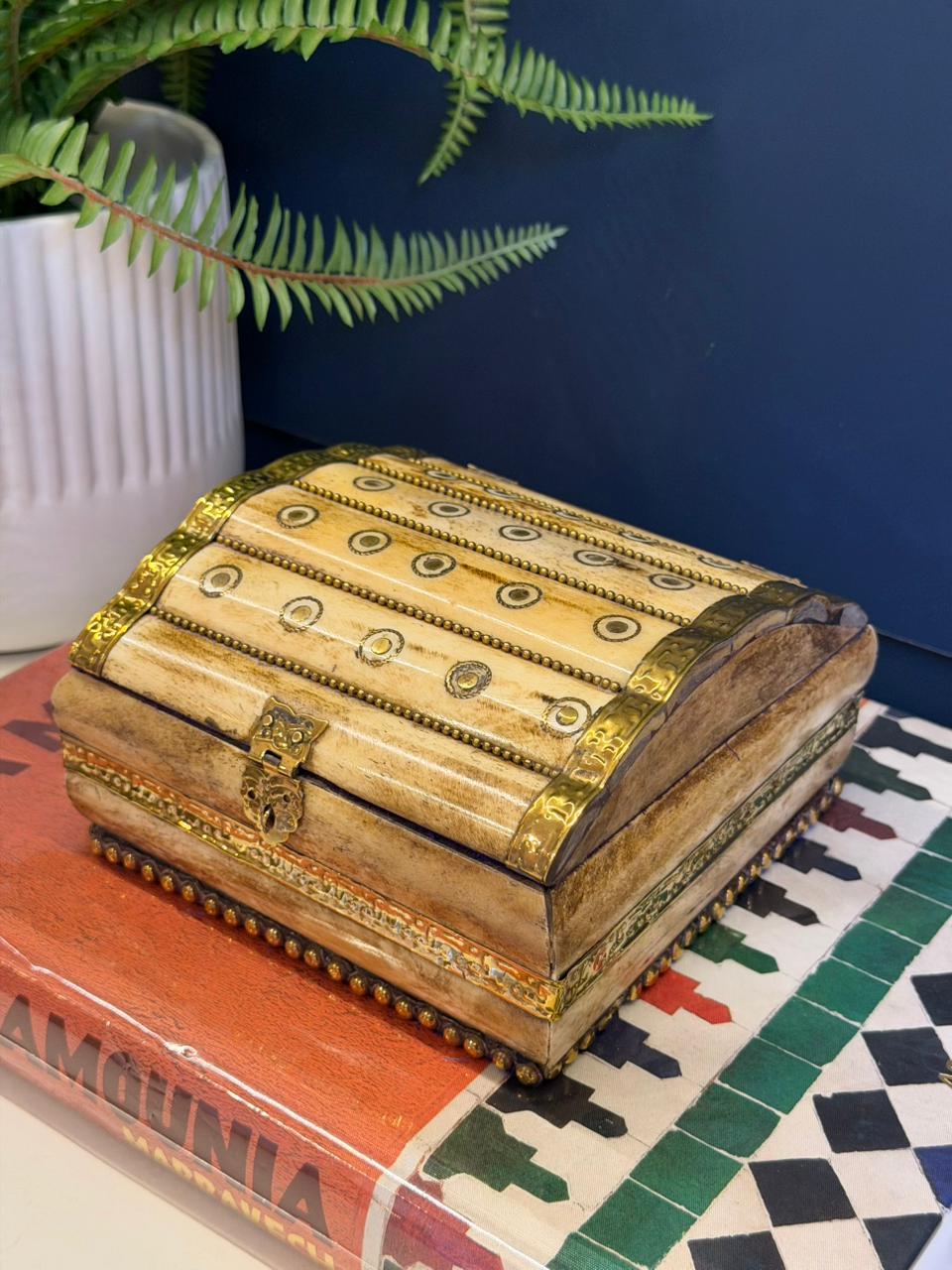 Esta caixa decorativa é uma peça produzida manualmente em osso, apresenta um padrão geométrico que traz sofisticação e personalidade à decoração.