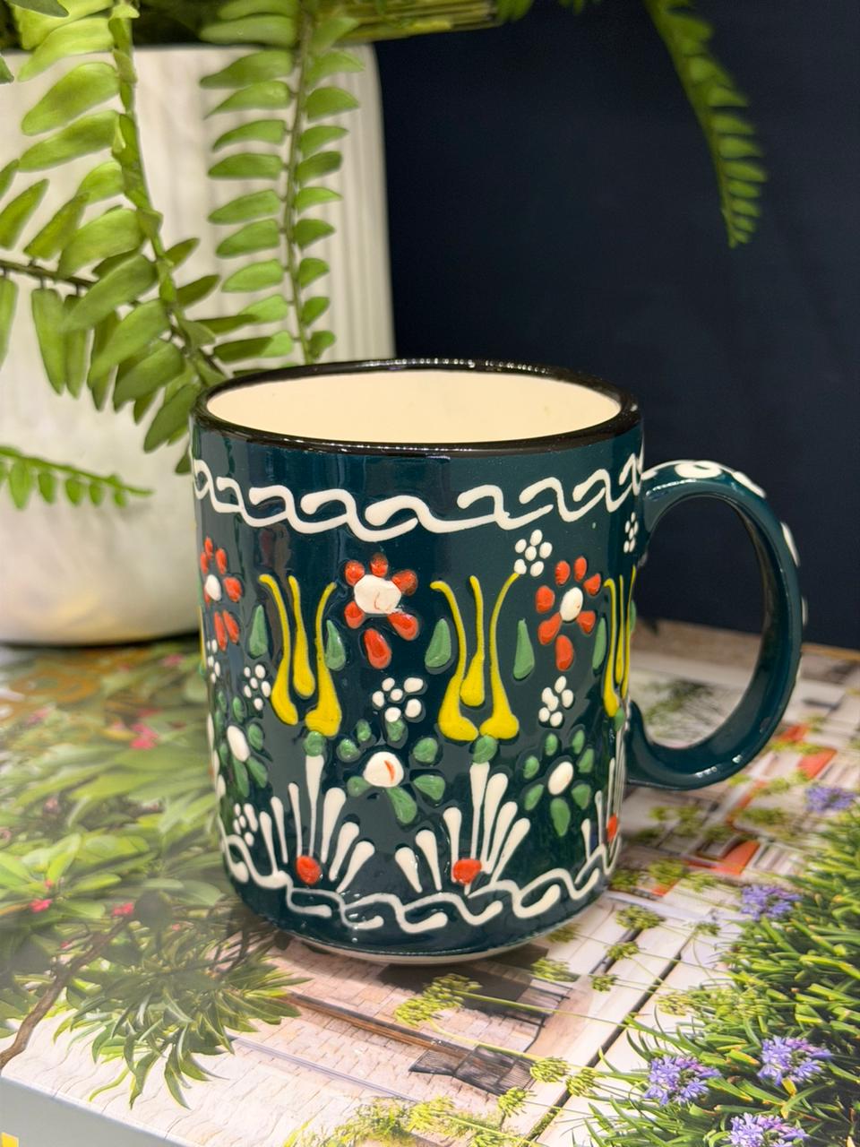 Caneca em cerâmica pintada à mão em alto relevo, com acabamento rico em detalhes e cores vibrantes que valorizam qualquer ambiente. Importada da Turquia, traz um design delicado e exclusivo, ideal para compor sua mesa com charme e personalidade. Além de funcional, é uma peça decorativa que transforma o momento do café ou chá em uma experiência especial.