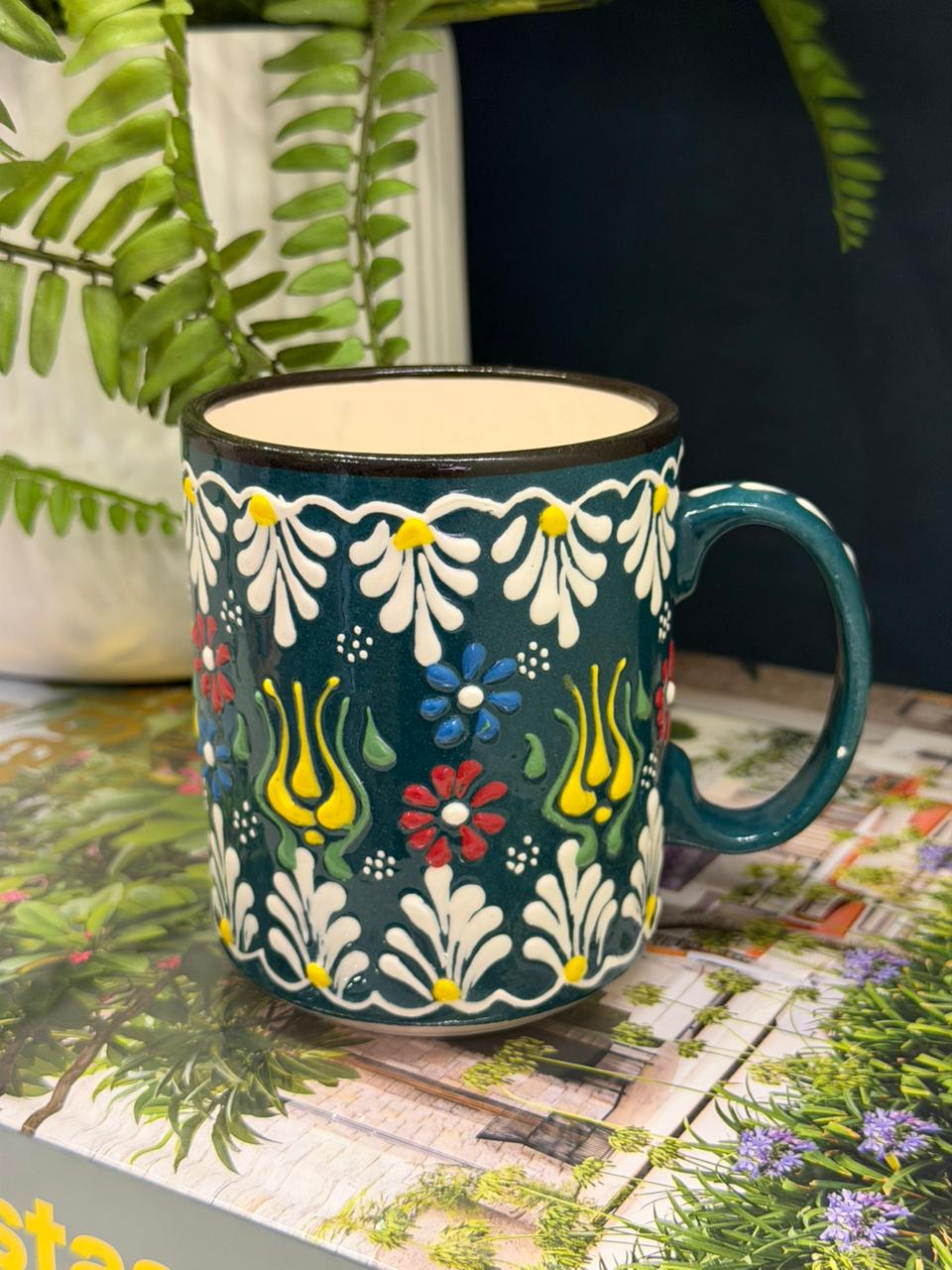 Caneca em cerâmica pintada à mão em alto relevo, com acabamento rico em detalhes e cores vibrantes que valorizam qualquer ambiente. Importada da Turquia, traz um design delicado e exclusivo, ideal para compor sua mesa com charme e personalidade. Além de funcional, é uma peça decorativa que transforma o momento do café ou chá em uma experiência especial.