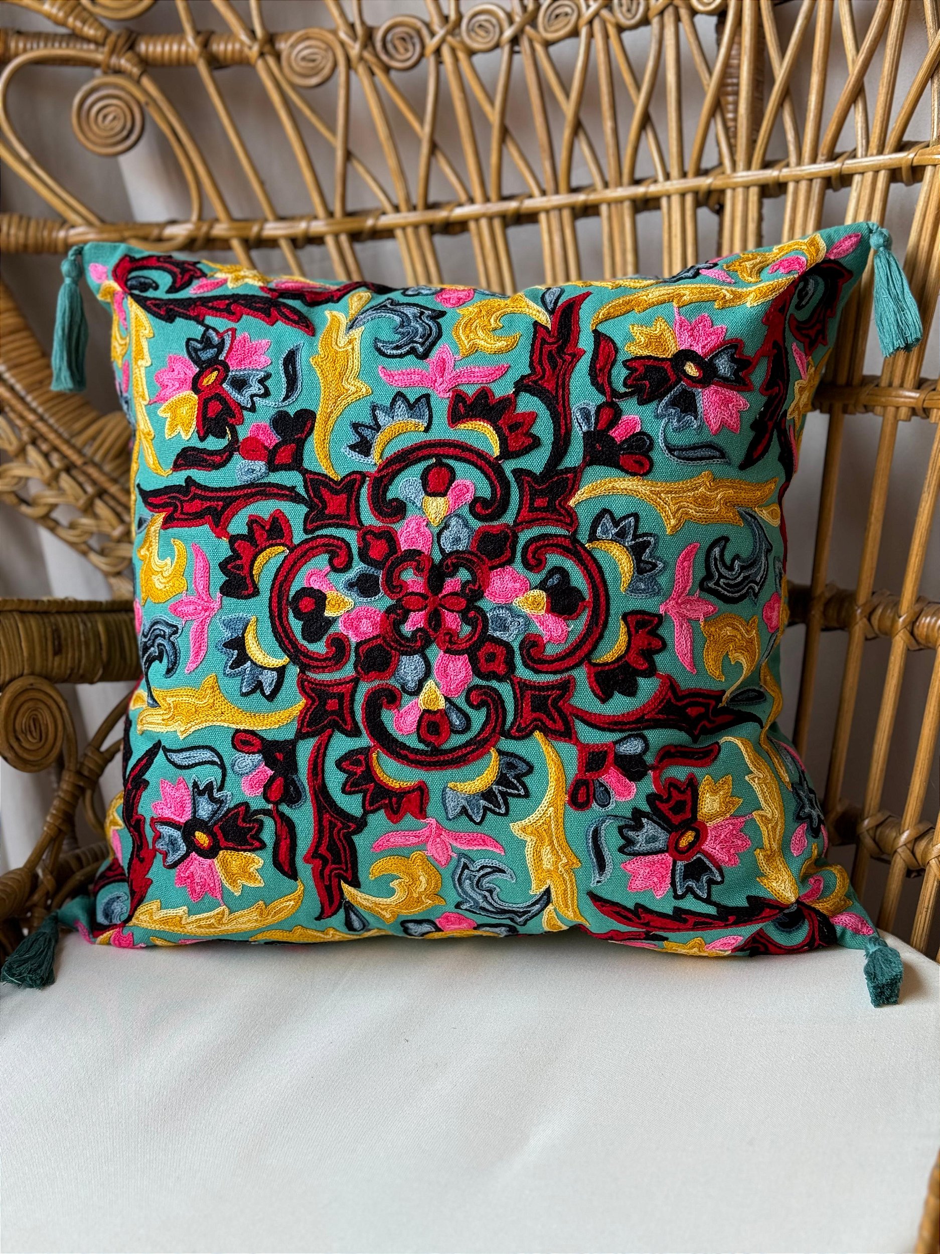 As capas de almofada são uma verdadeira peça artesanal feitas na Índia, rica em detalhes com o trabalho minusioso com bordado em brim e linhas de algodão, tornando cada peça única, com personalidade e sofisticação.