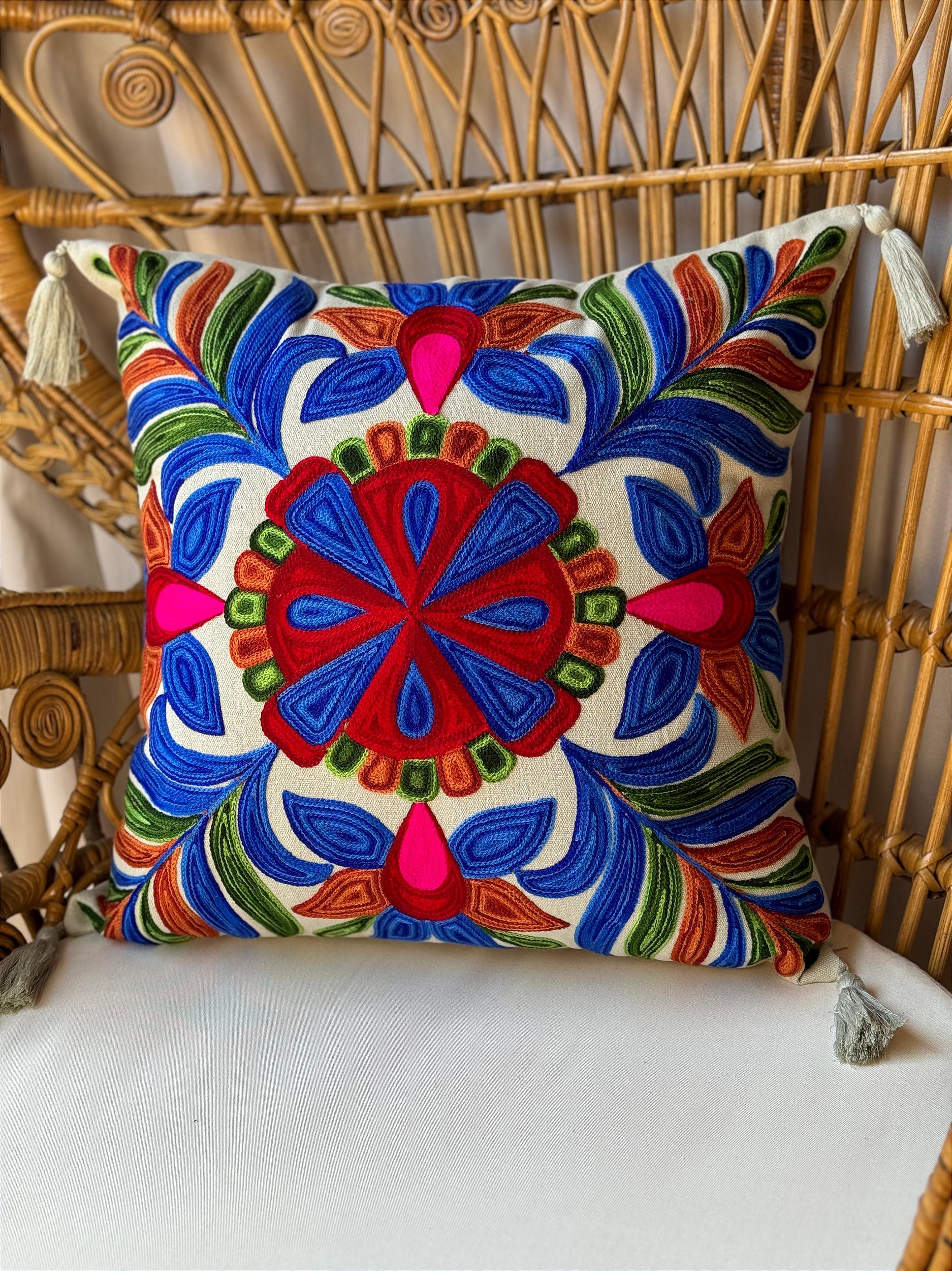 As capas de almofada são uma verdadeira peça artesanal feitas na Índia, rica em detalhes com o trabalho minusioso com bordado em brim e linhas de algodão, tornando cada peça única, com personalidade e sofisticação.
