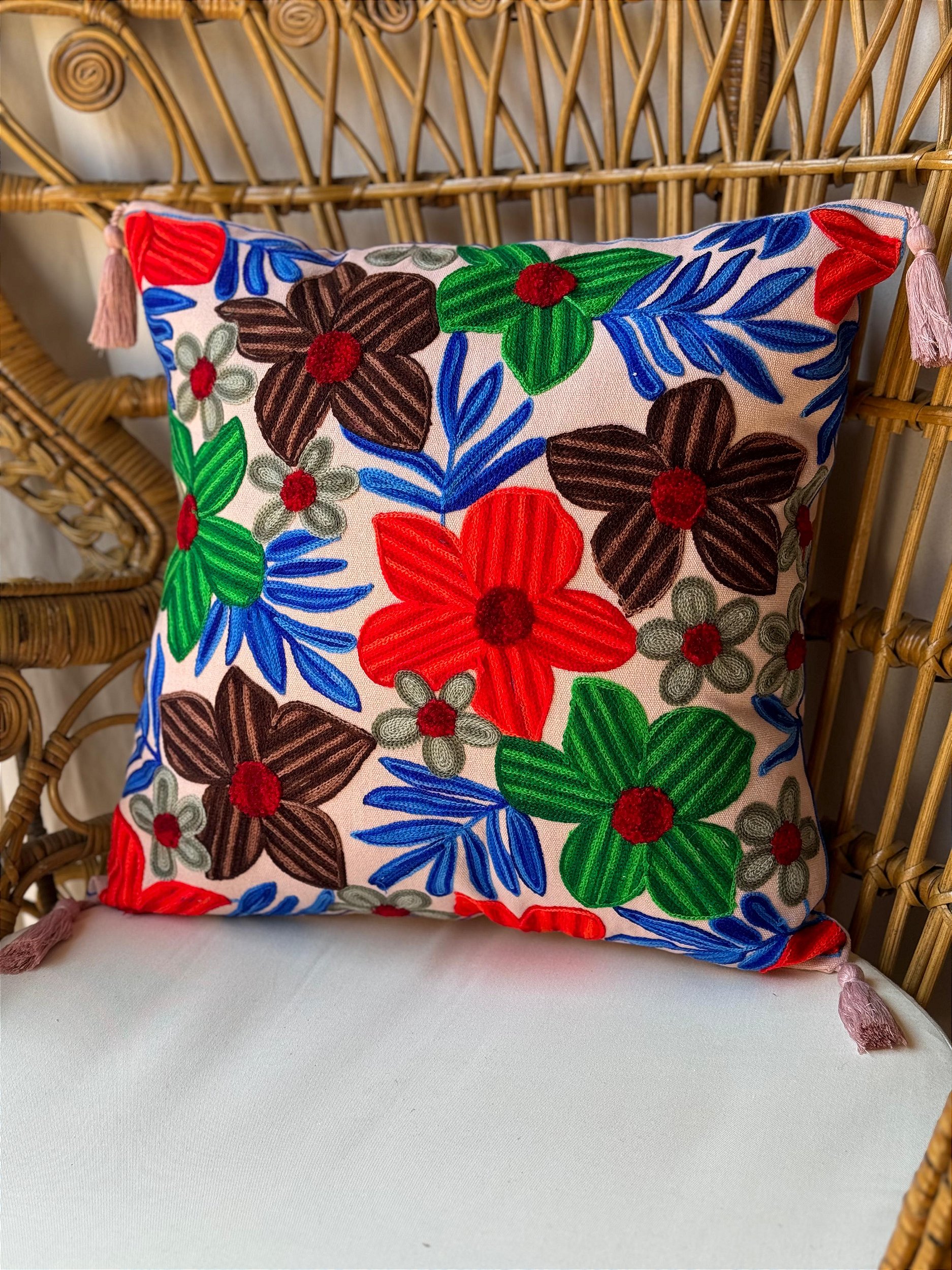 As capas de almofada são uma verdadeira peça artesanal feitas na Índia, rica em detalhes com o trabalho minusioso com bordado em brim e linhas de algodão, tornando cada peça única, com personalidade e sofisticação.