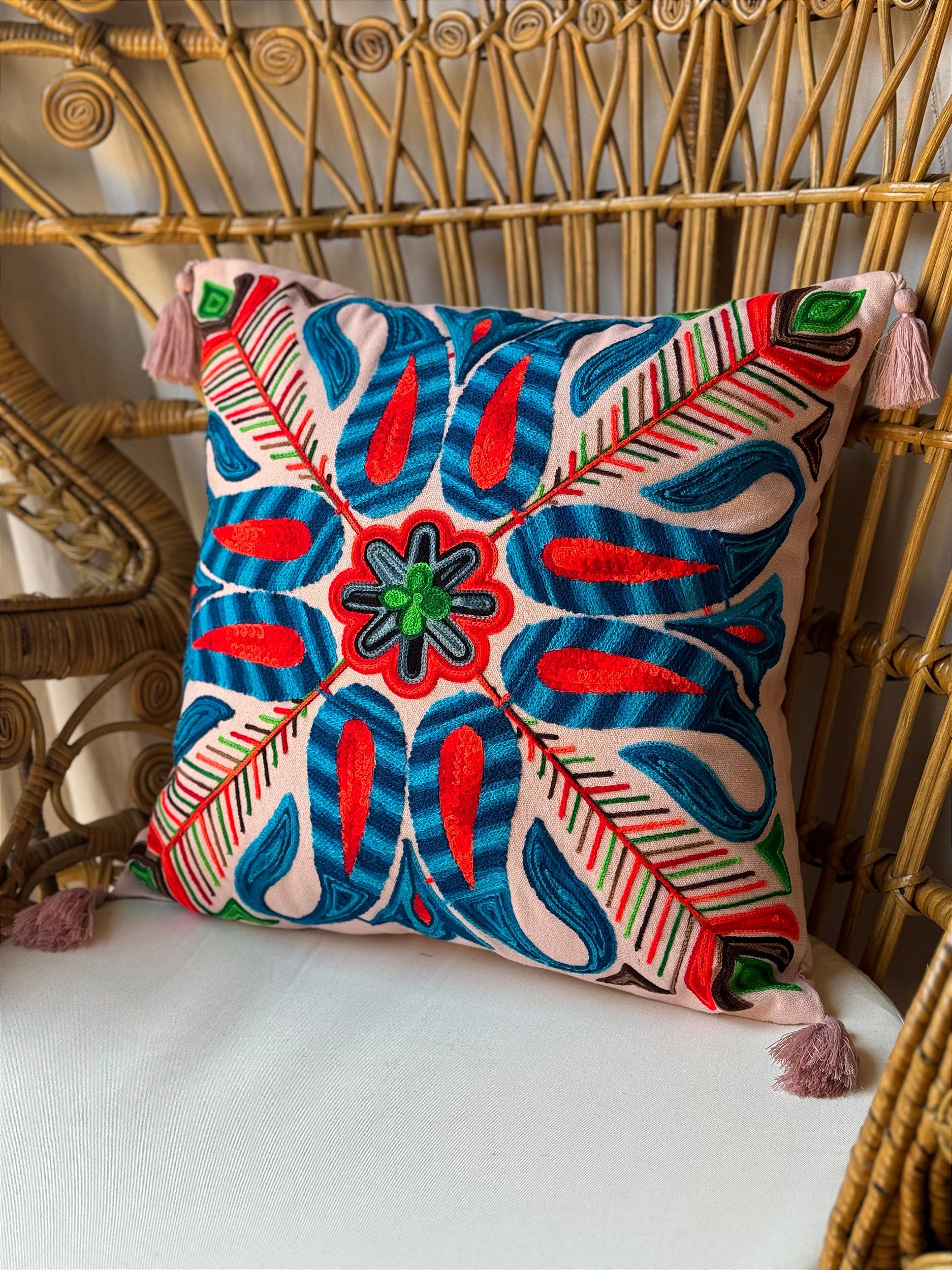 As capas de almofada são uma verdadeira peça artesanal feitas na Índia, rica em detalhes com o trabalho minusioso com bordado em brim e linhas de algodão, tornando cada peça única, com personalidade e sofisticação.