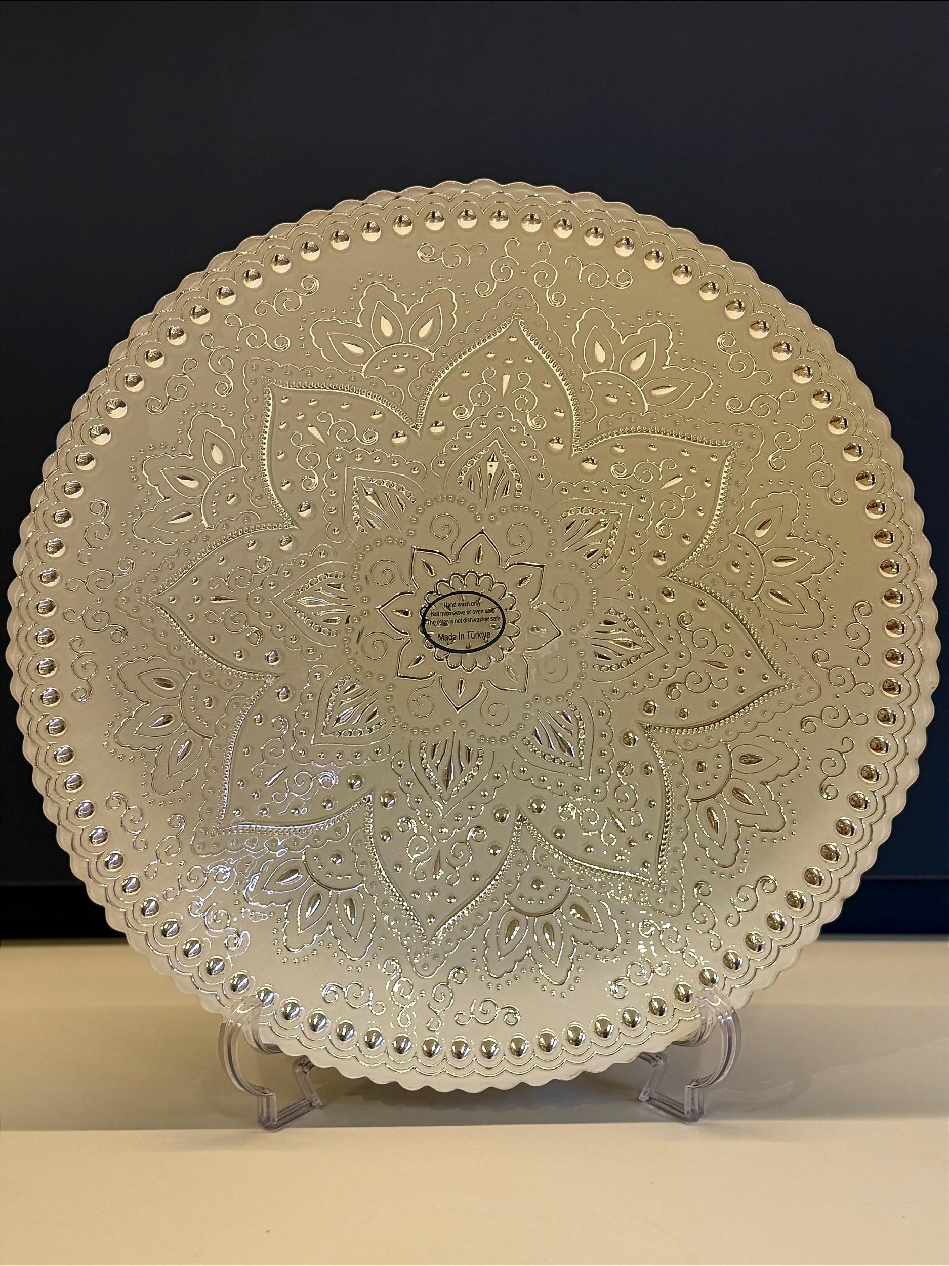Centro de mesa artesanal produzido na Turquia, confeccionado em vitral pintado à mão, com acabamento minucioso e brilho sofisticado. Seu desenho cria um efeito visual único, refletindo a luz de forma delicada e valorizando ainda mais a peça.