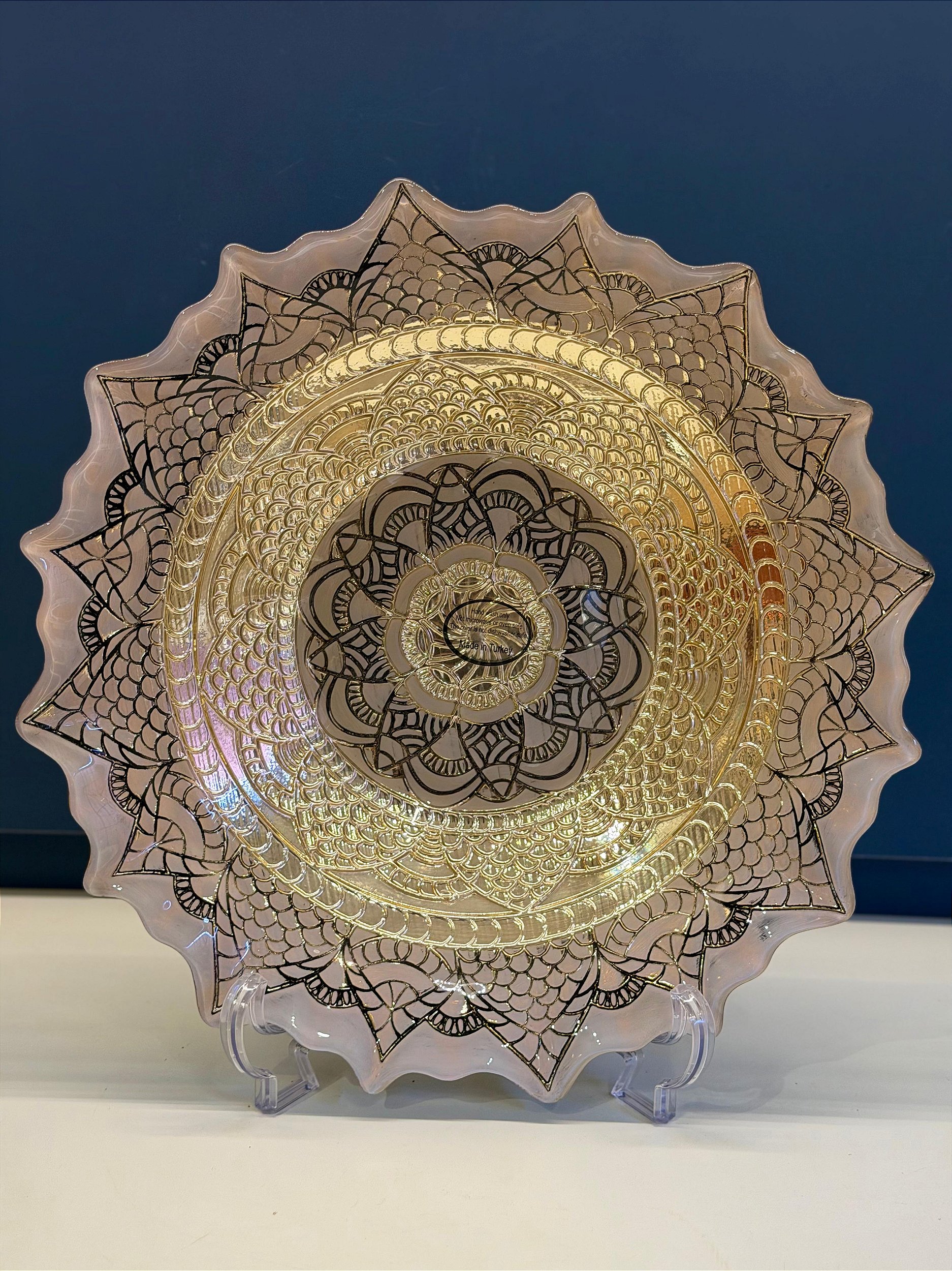 Centro de mesa artesanal produzido na Turquia, confeccionado em vitral pintado à mão, com acabamento minucioso e brilho sofisticado. Seu desenho cria um efeito visual único, refletindo a luz de forma delicada e valorizando ainda mais a peça.