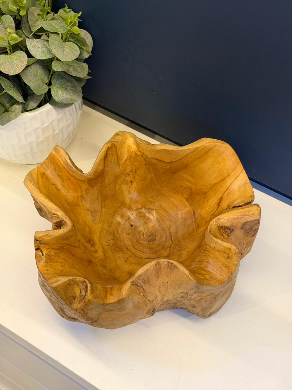 Centro de mesa esculpido em madeira maciça, com formato orgânico que valoriza os veios naturais e as curvas únicas da madeira. Cada peça é exclusiva, preservando a beleza natural do material, com acabamento suave ao toque e tonalidade quente que traz aconchego e sofisticação ao ambiente.