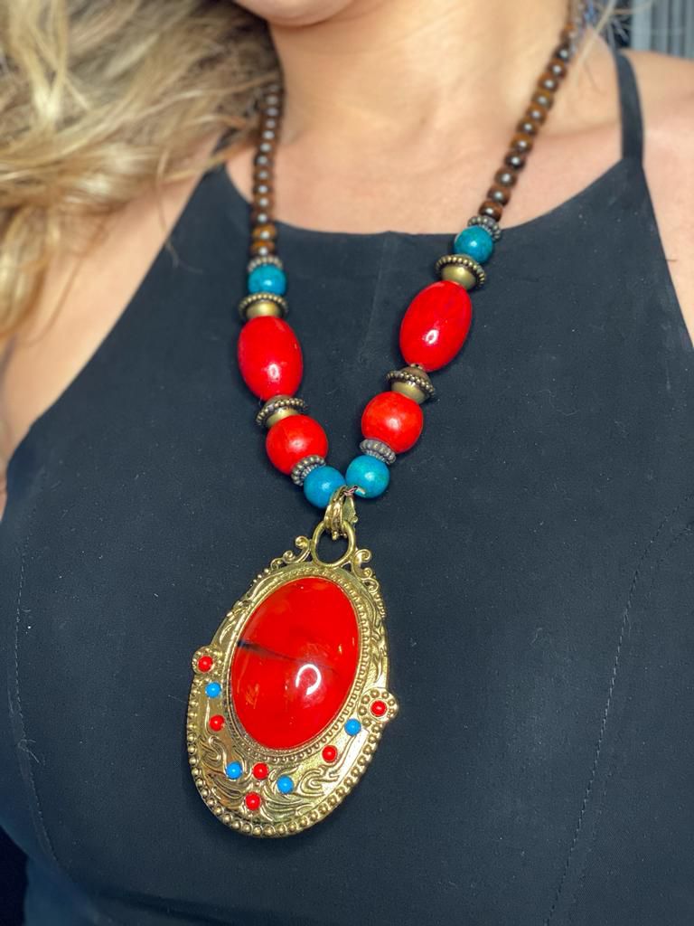Nossos colares são feitos artesanalmente, é uma peça marcante, rica em detalhes e personalidade. Composto por cores em tons vibrantes, intercaladas com acabamentos metálicos, ele traz um visual sofisticado e cheio de presença.