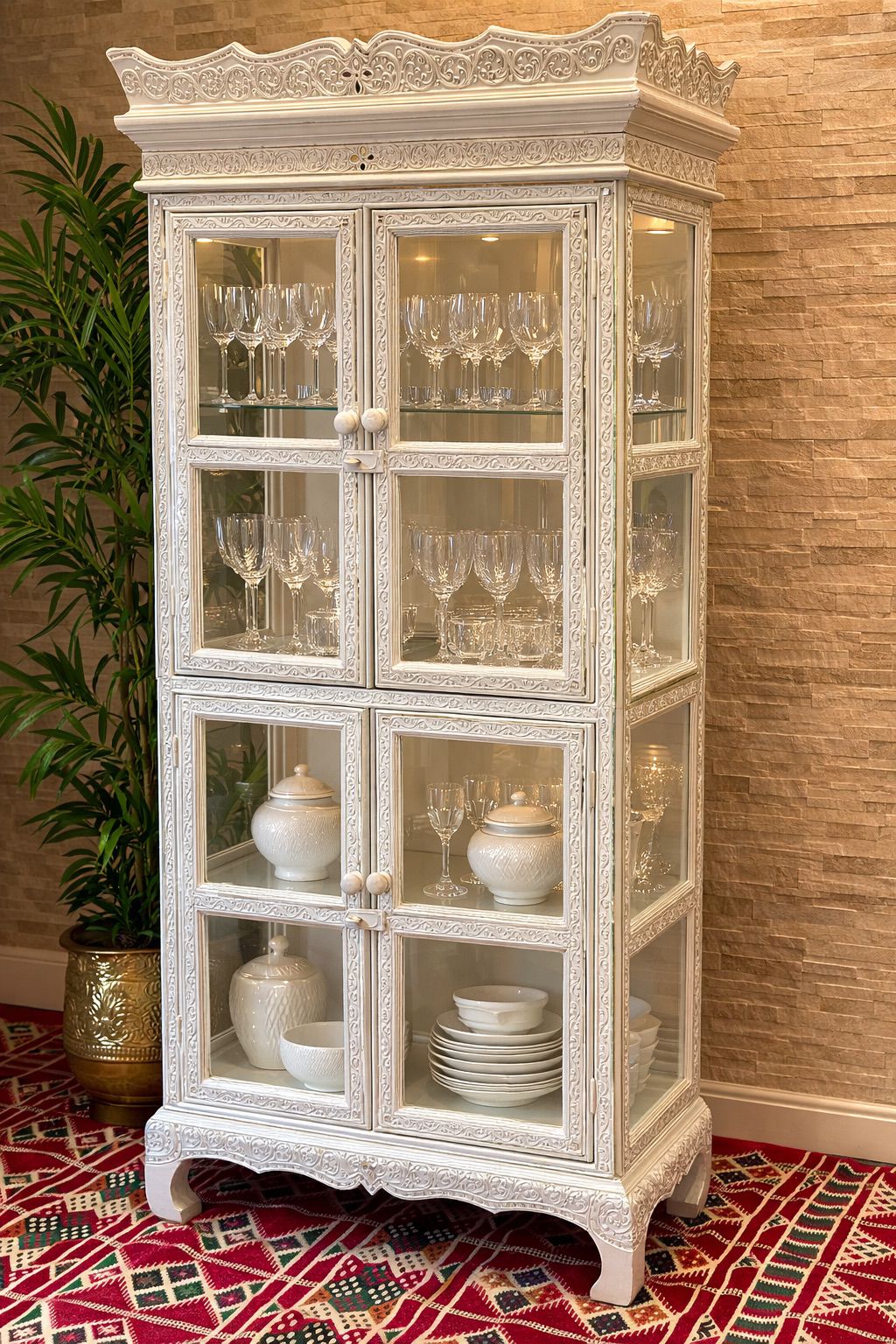 Esta cristaleira é uma peça de grande presença e elegância, ideal para compor ambientes sofisticados e acolhedores. Produzida em madeira com acabamento patinado claro, ela se destaca pelos ricos entalhes artesanais que percorrem toda a estrutura, trazendo delicadeza e personalidade ao móvel.