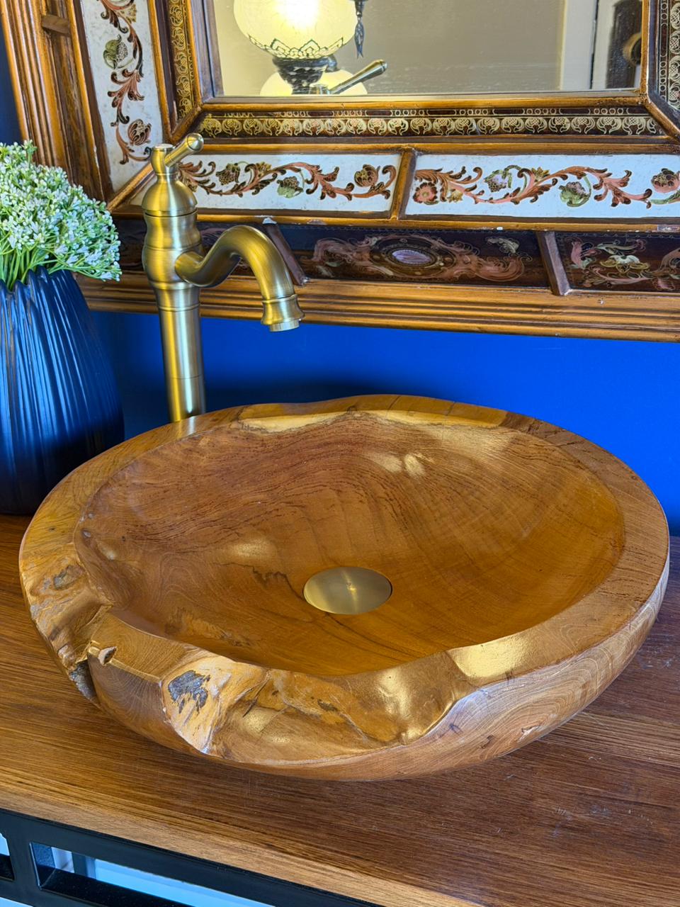 Cuba de lavabo produzida em madeira maciça, esculpida artesanalmente, o que torna cada peça exclusiva e única. Seu design orgânico valoriza os veios naturais da madeira, trazendo aconchego, sofisticação e um toque rústico-elegante ao ambiente.
