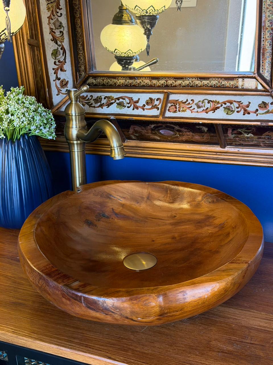 Cuba de lavabo produzida em madeira maciça, esculpida artesanalmente, o que torna cada peça exclusiva e única. Seu design orgânico valoriza os veios naturais da madeira, trazendo aconchego, sofisticação e um toque rústico-elegante ao ambiente.