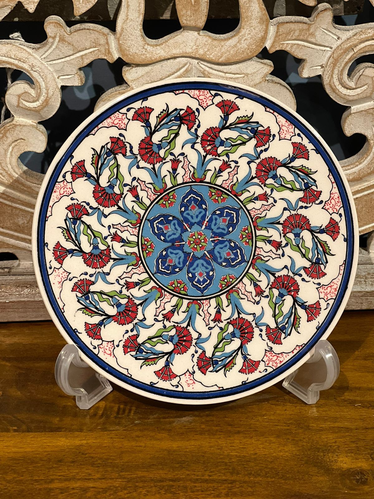 Descanso de Travessa e Panela - Turca - Redondo - Cerâmica - Vermelho e Azul Fundo Branco