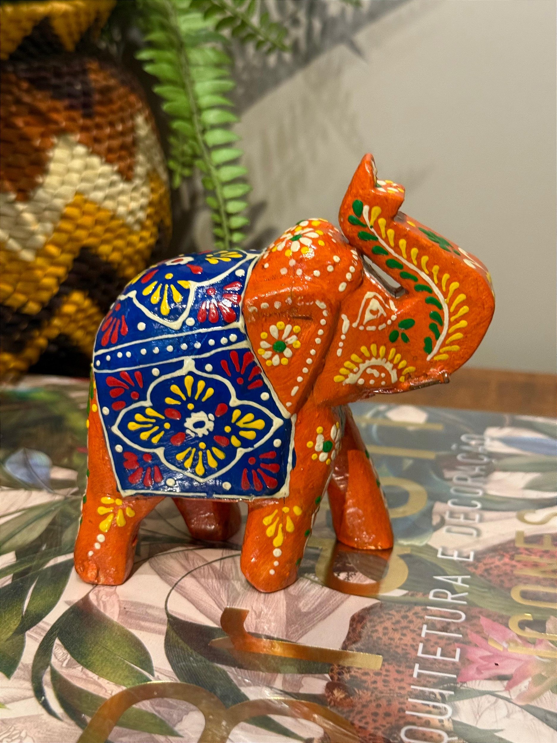 Elefante - Madeira - Pintado à mão - Laranja e Colorido - 11CM
