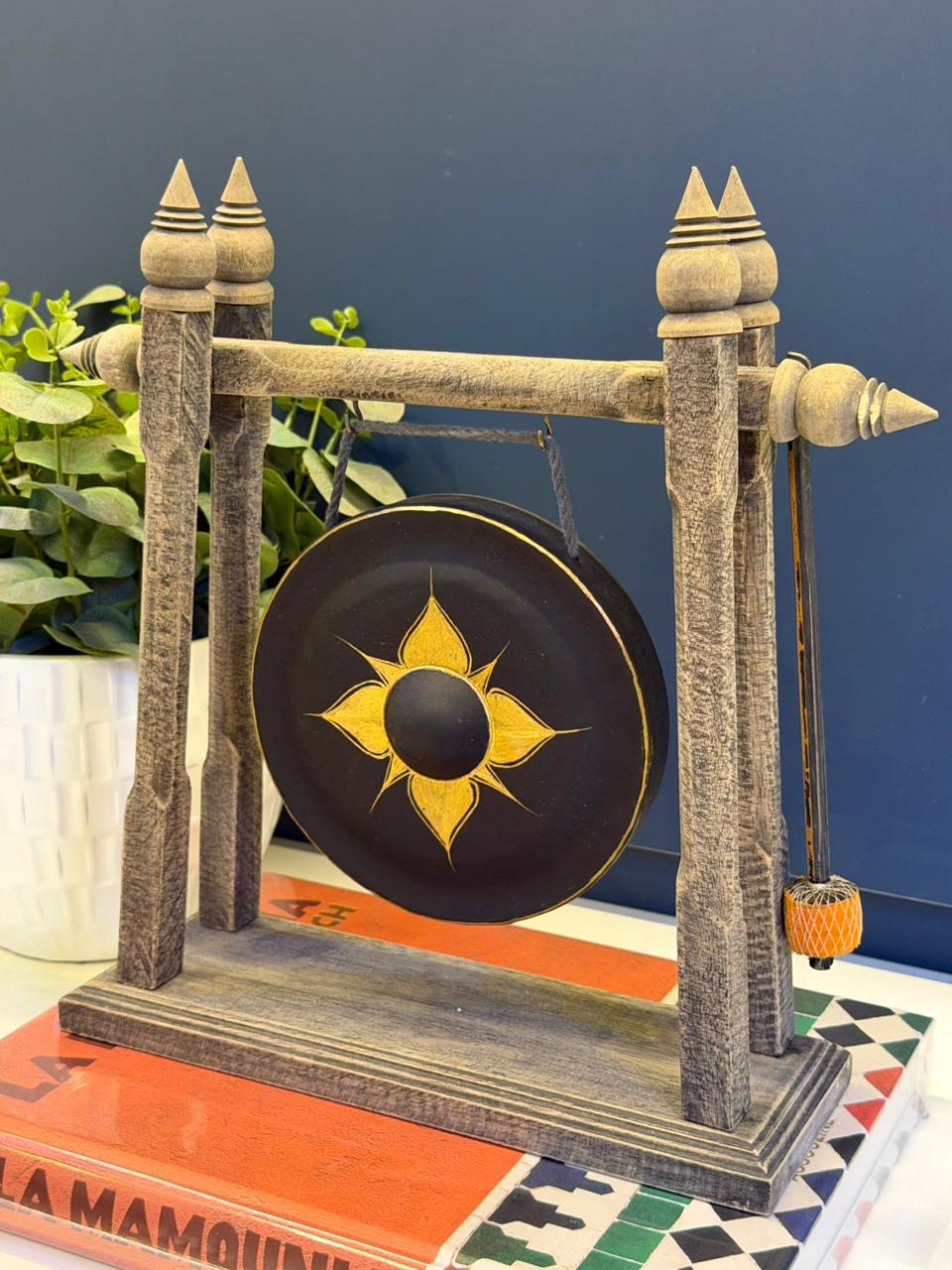 Escultura Sino Gongo- Decorativo - Madeira e Latão - Marrom e Dourado