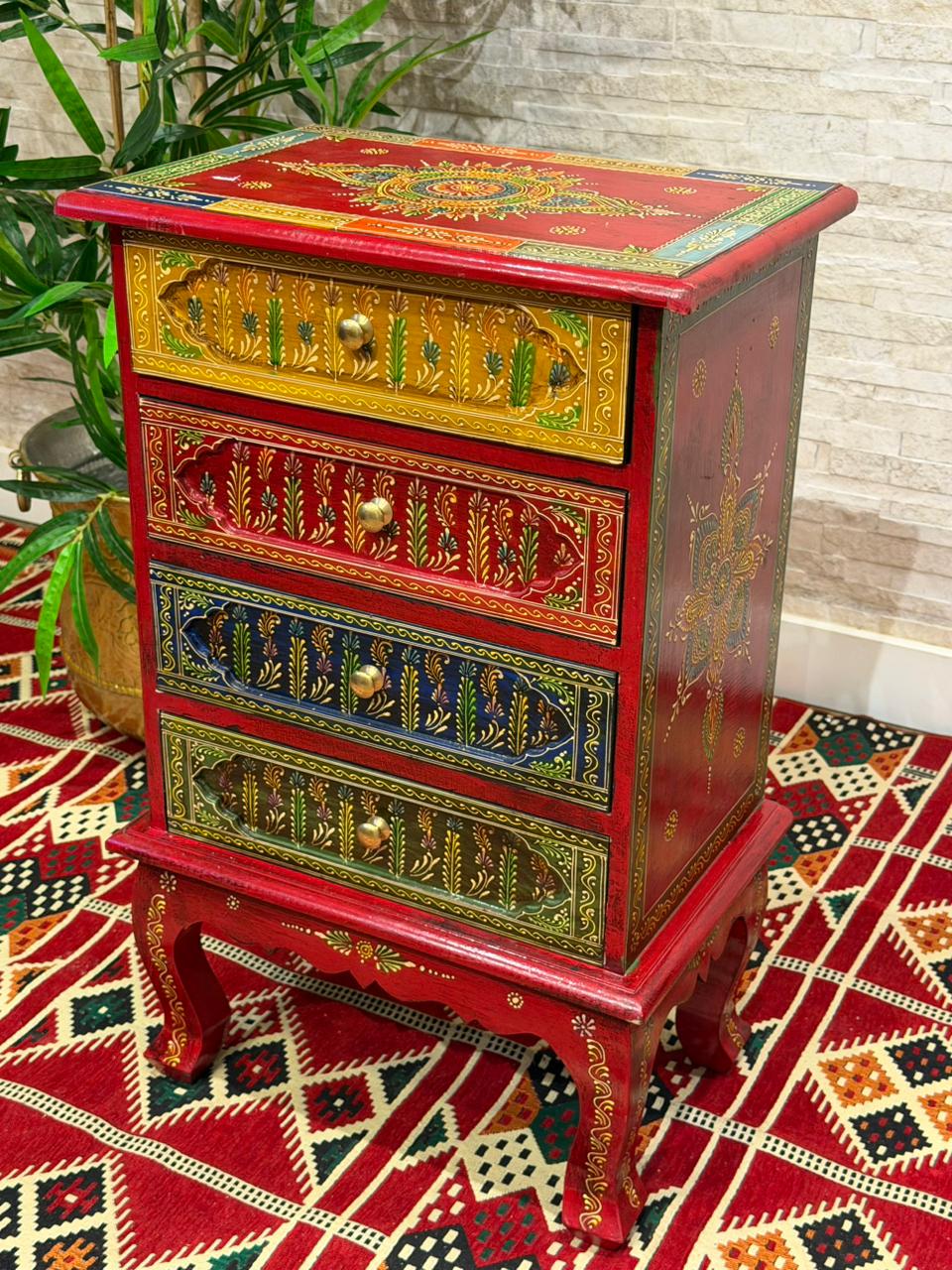 Encanto para quem ama decoração com alma. Este gaveteiro Indiano é inteiramente trabalhado em madeira e recebe delicados desenhos pintados à mão, trazendo o charme e a autenticidade do artesanato.