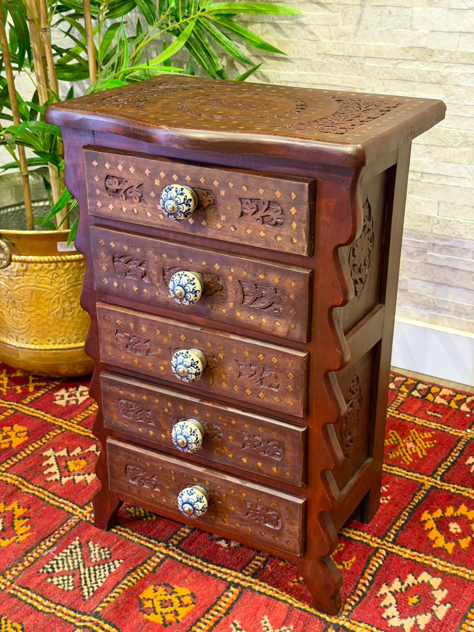 Encanto para quem ama decoração com alma. Este gaveteiro Indiano é inteiramente trabalhado em madeira e recebe delicados desenhos pintados à mão, trazendo o charme e a autenticidade do artesanato.