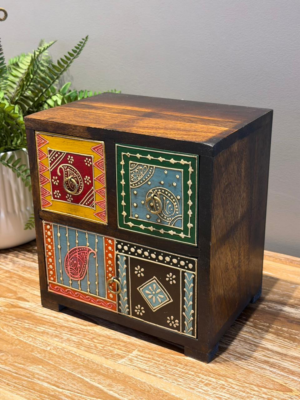 Produzida em madeira, pintadas a mão. Além de decorar, é extremamente funcional: perfeita para organizar pequenos objetos, acessórios, controles, lembranças ou itens do dia a dia, mantendo o ambiente elegante e bem organizado.