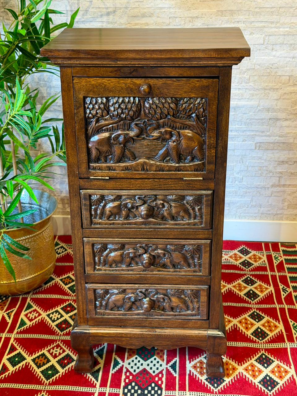 Encanto para quem ama decoração com alma. Este gaveteiro Indiano é inteiramente trabalhado em madeira e recebe delicados desenhos pintados à mão, trazendo o charme e a autenticidade do artesanato.
