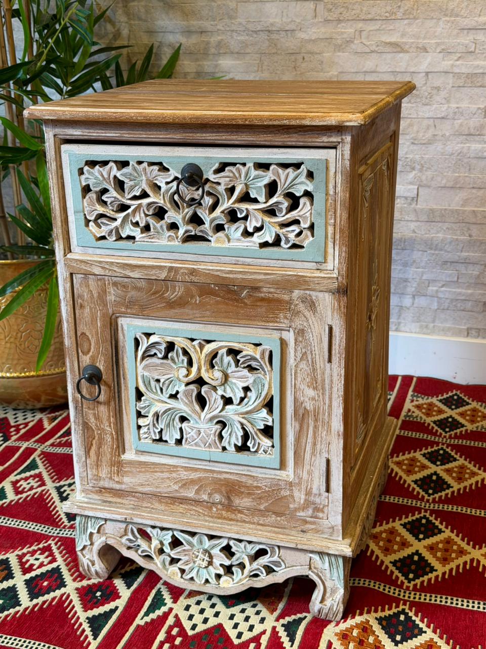Encanto para quem ama decoração com alma. Este gaveteiro Indiano é inteiramente trabalhado em madeira e recebe delicados desenhos pintados à mão, trazendo o charme e a autenticidade do artesanato.