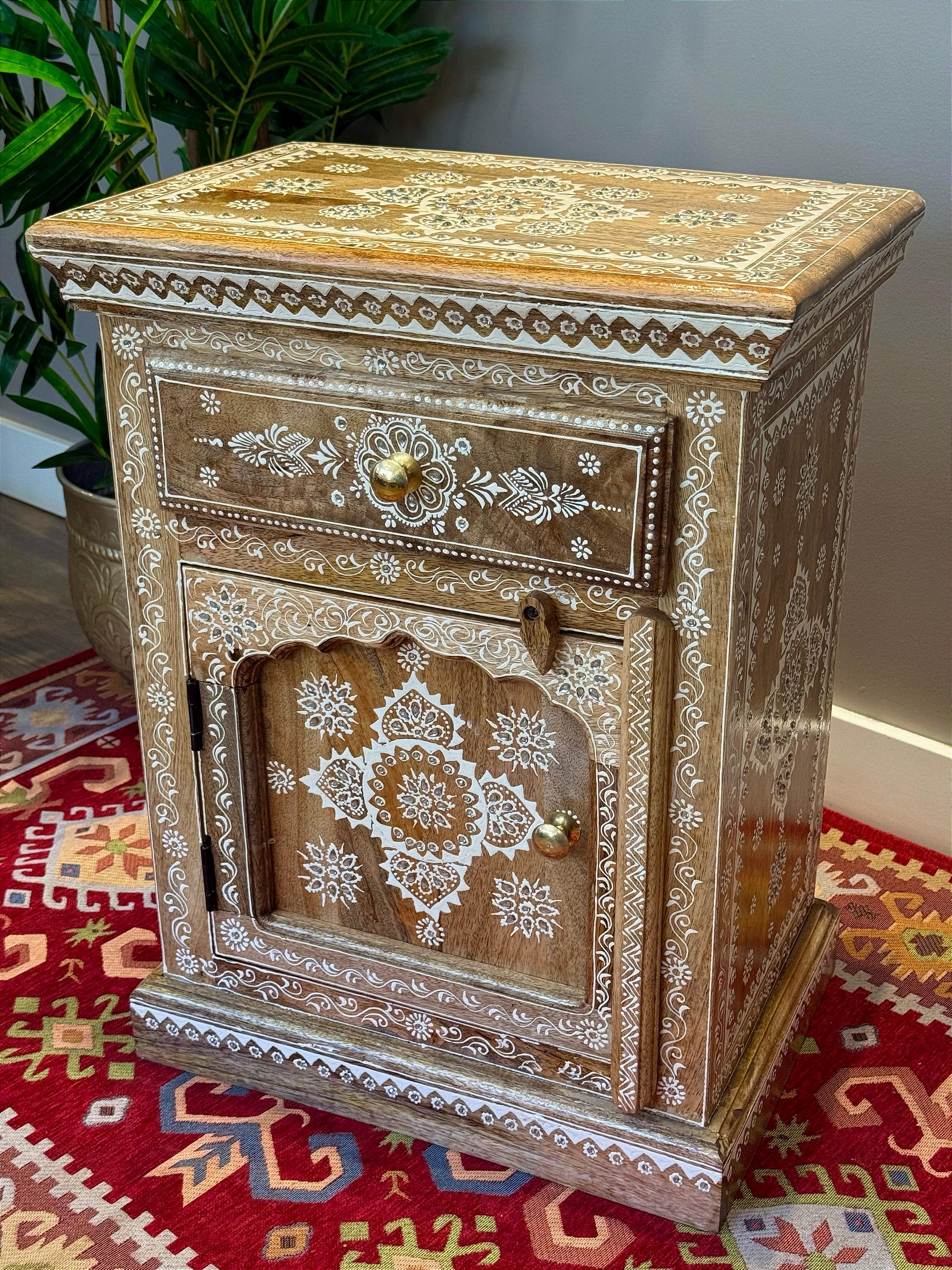 Encanto para quem ama decoração com alma. Este gaveteiro Indiano é inteiramente trabalhado em madeira e recebe delicados desenhos pintados à mão, trazendo o charme e a autenticidade do artesanato.