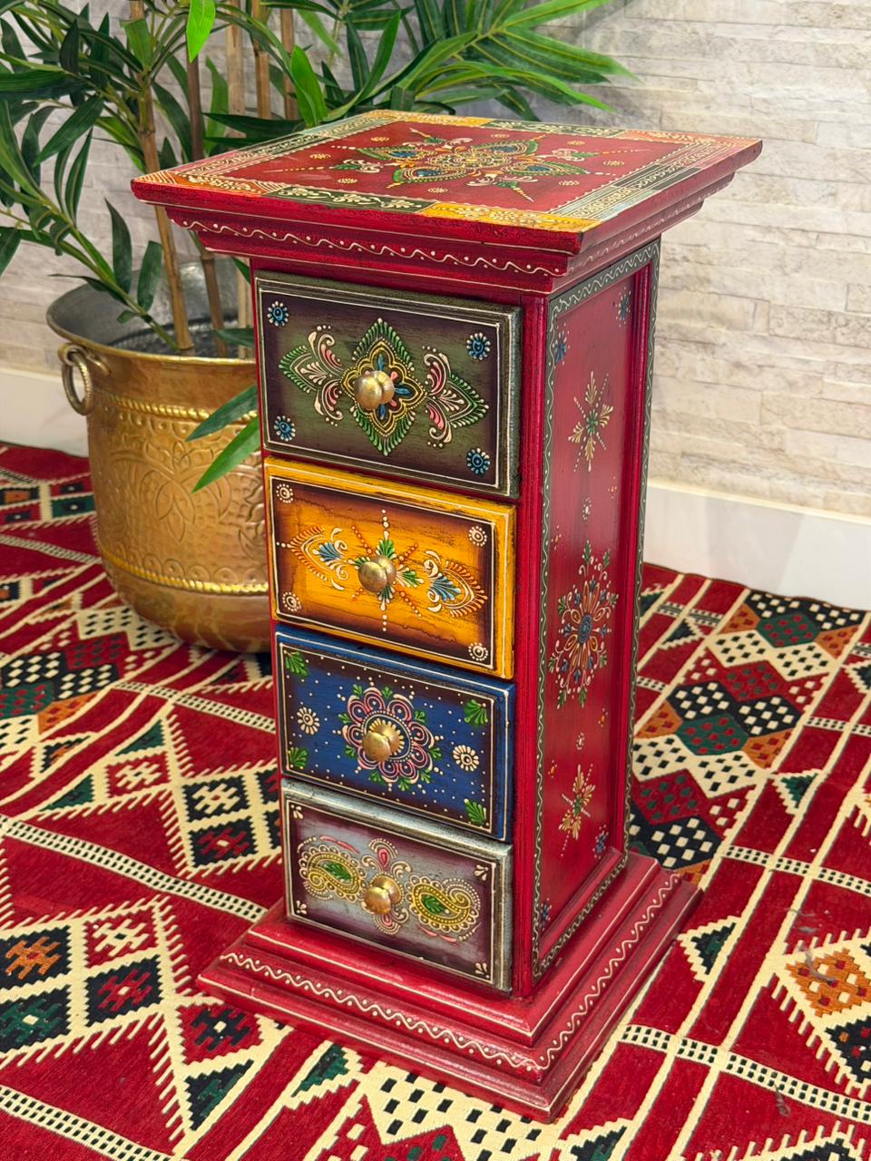Encanto para quem ama decoração com alma. Este gaveteiro Indiano é inteiramente trabalhado em madeira e recebe delicados desenhos pintados à mão, trazendo o charme e a autenticidade do artesanato.