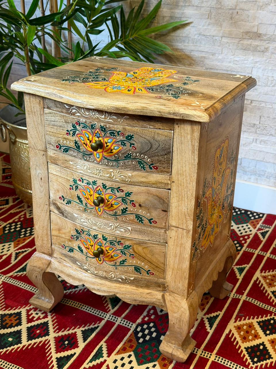 Encanto para quem ama decoração com alma. Este gaveteiro Indiano é inteiramente trabalhado em madeira e recebe delicados desenhos pintados à mão, trazendo o charme e a autenticidade do artesanato.
