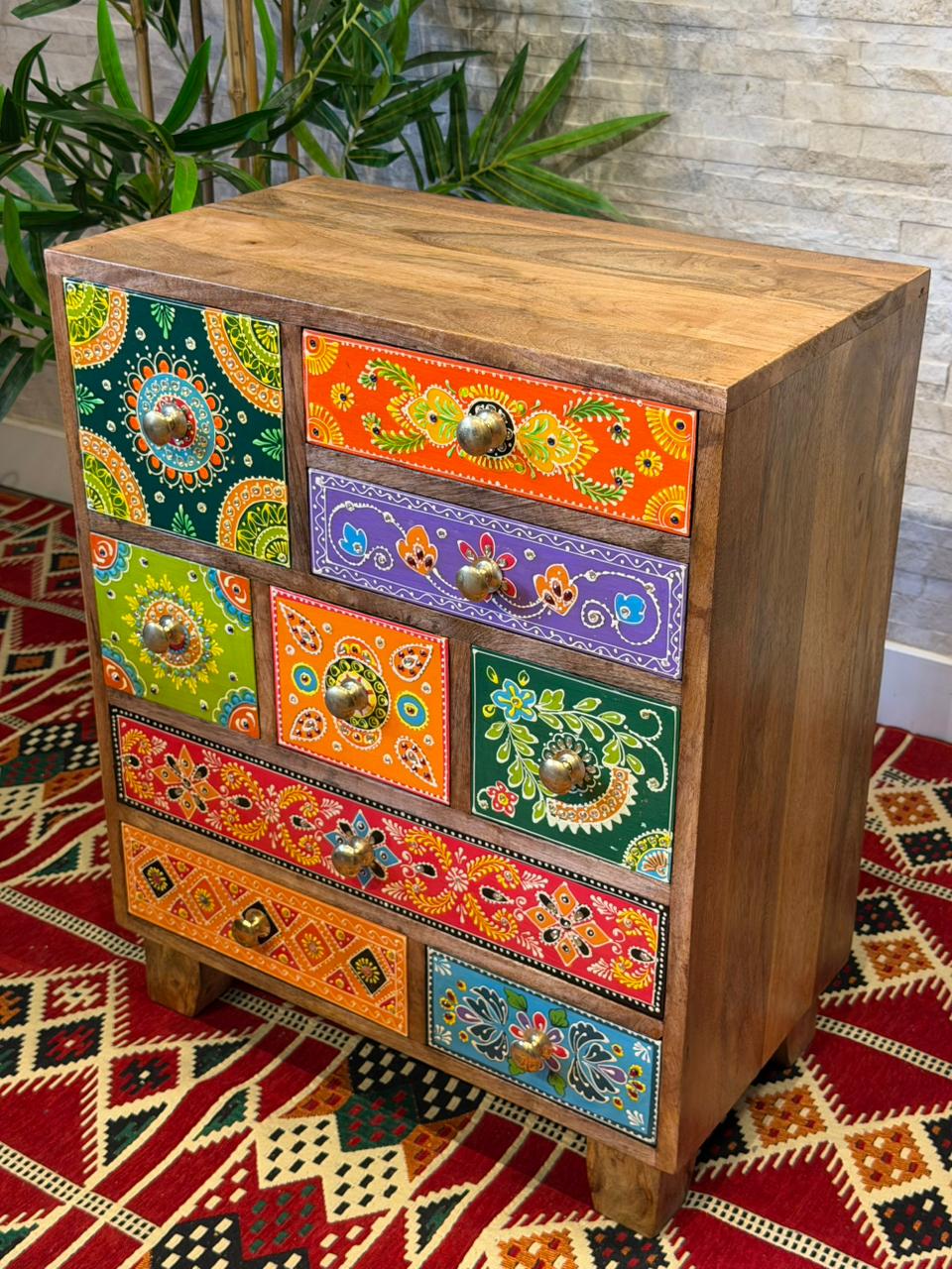Encanto para quem ama decoração com alma. Este gaveteiro Indiano é inteiramente trabalhado em madeira e recebe delicados desenhos pintados à mão, trazendo o charme e a autenticidade do artesanato.