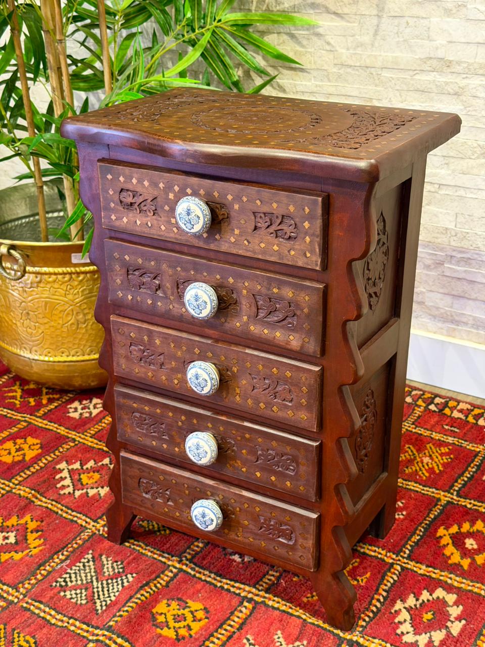 Encanto para quem ama decoração com alma. Este gaveteiro Indiano é inteiramente trabalhado em madeira e recebe delicados desenhos pintados à mão, trazendo o charme e a autenticidade do artesanato.