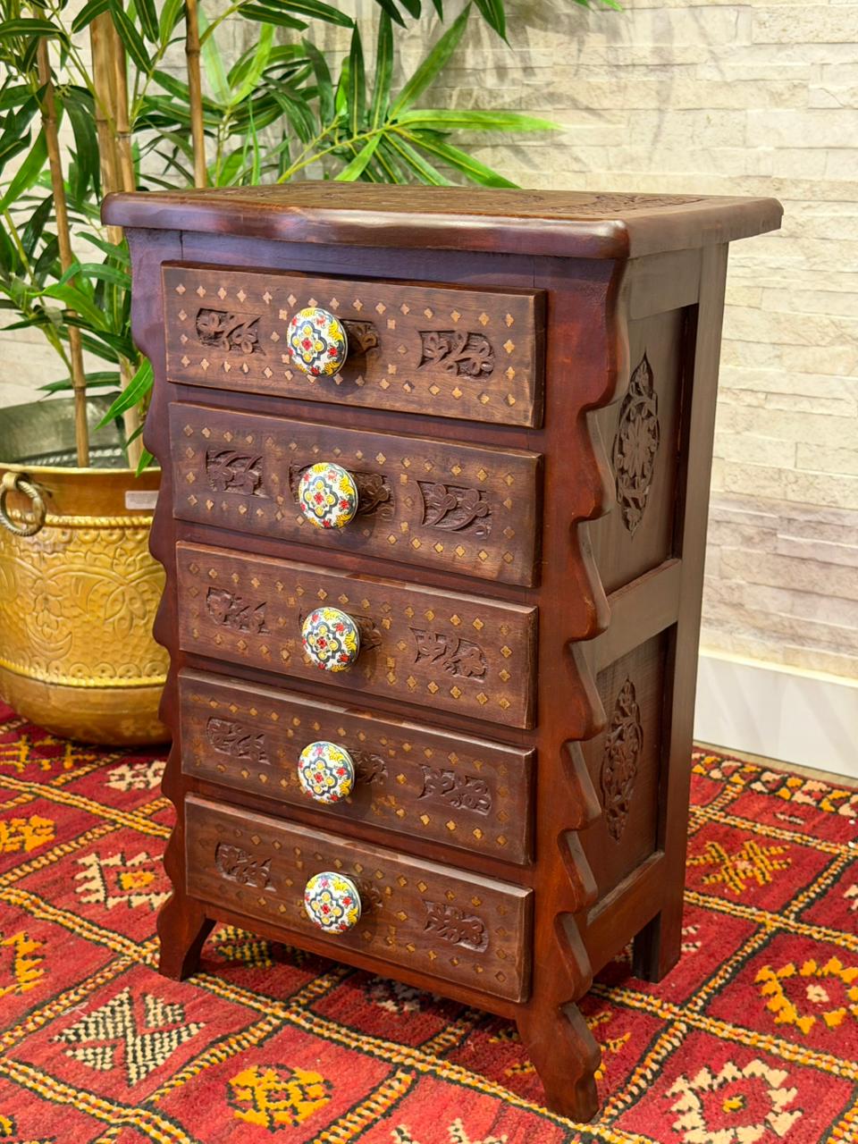 Encanto para quem ama decoração com alma. Este gaveteiro Indiano é inteiramente trabalhado em madeira e recebe delicados desenhos pintados à mão, trazendo o charme e a autenticidade do artesanato.