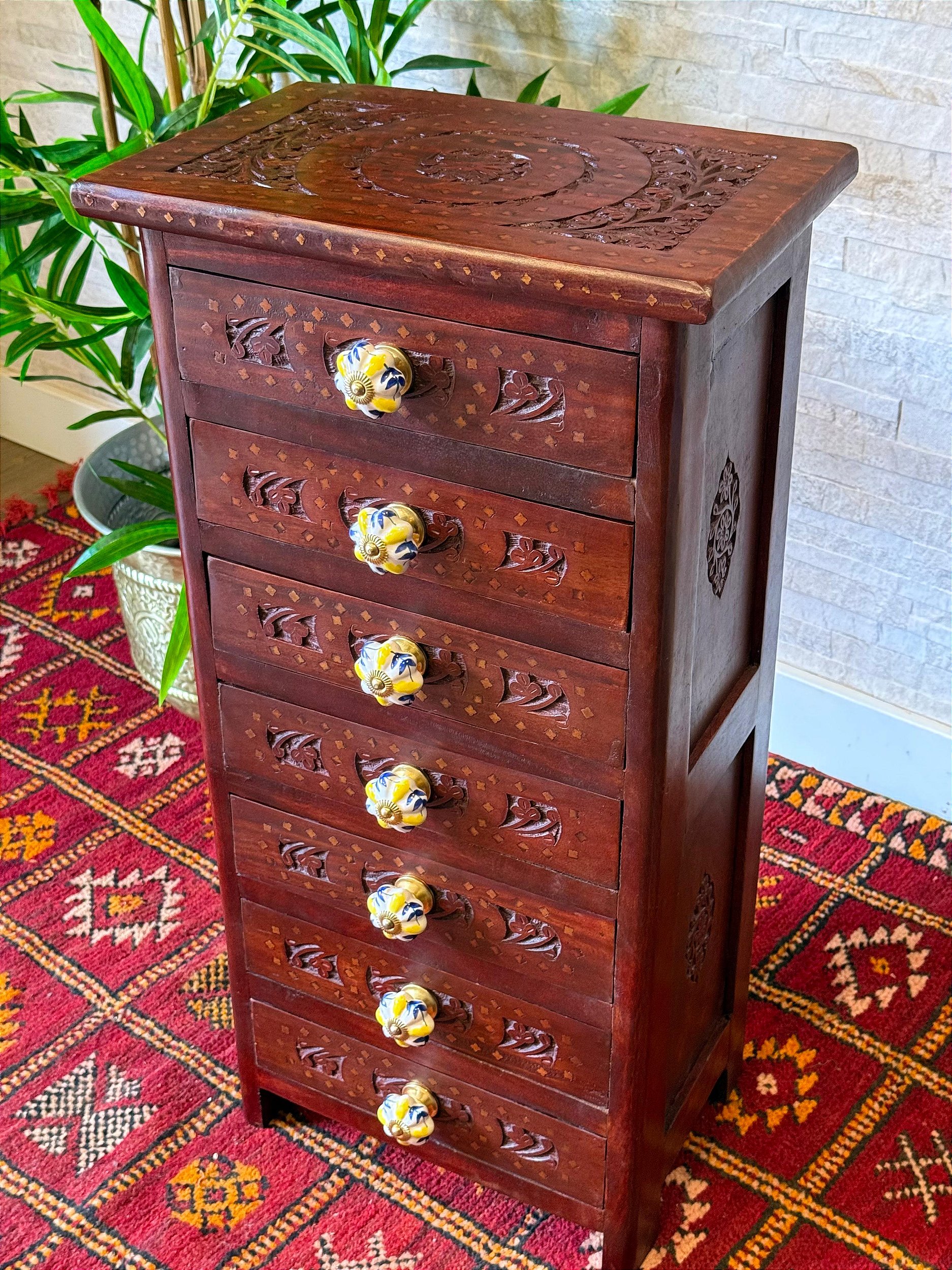 Encanto para quem ama decoração com alma. Este gaveteiro Indiano é inteiramente trabalhado em madeira e recebe delicados desenhos pintados à mão, trazendo o charme e a autenticidade do artesanato.