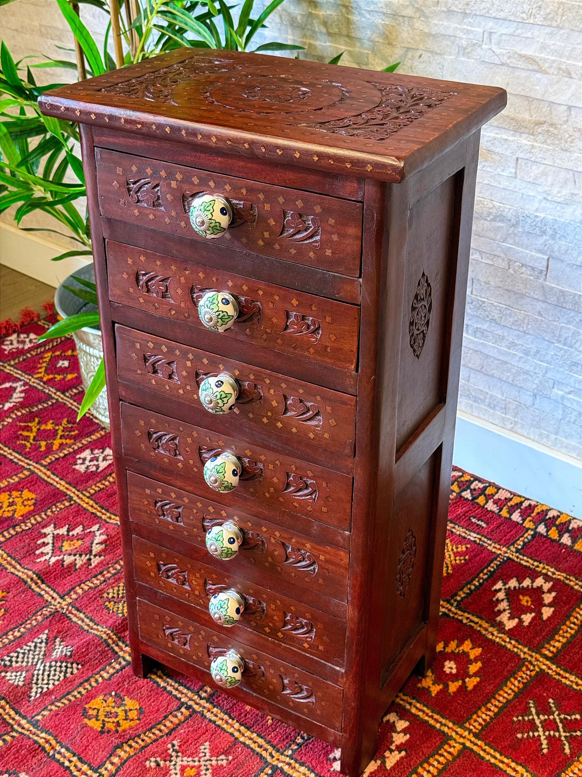 Encanto para quem ama decoração com alma. Este gaveteiro Indiano é inteiramente trabalhado em madeira e recebe delicados desenhos pintados à mão, trazendo o charme e a autenticidade do artesanato.
