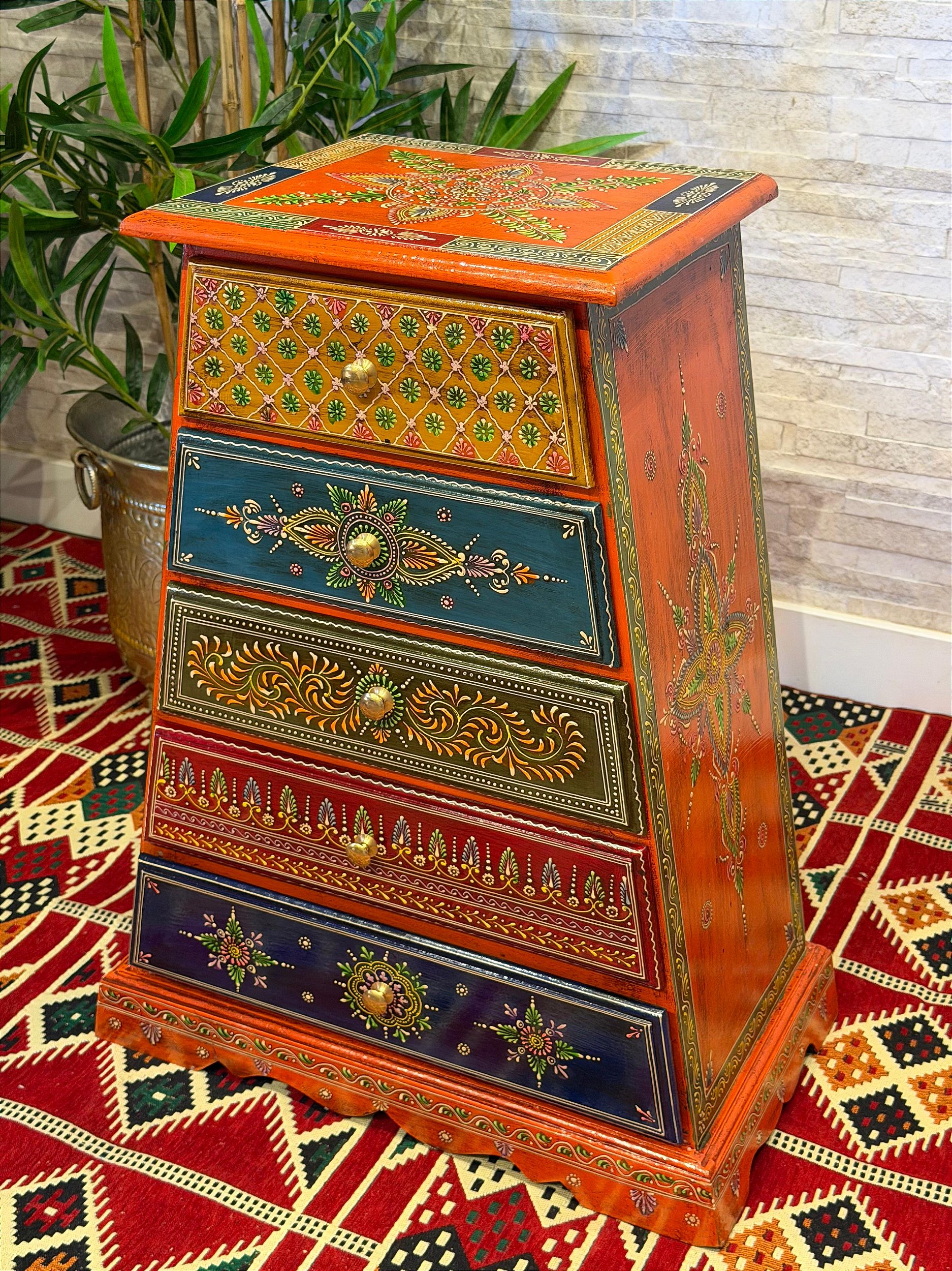Encanto para quem ama decoração com alma. Este gaveteiro Indiano é inteiramente trabalhado em madeira e recebe delicados desenhos pintados à mão, trazendo o charme e a autenticidade do artesanato.