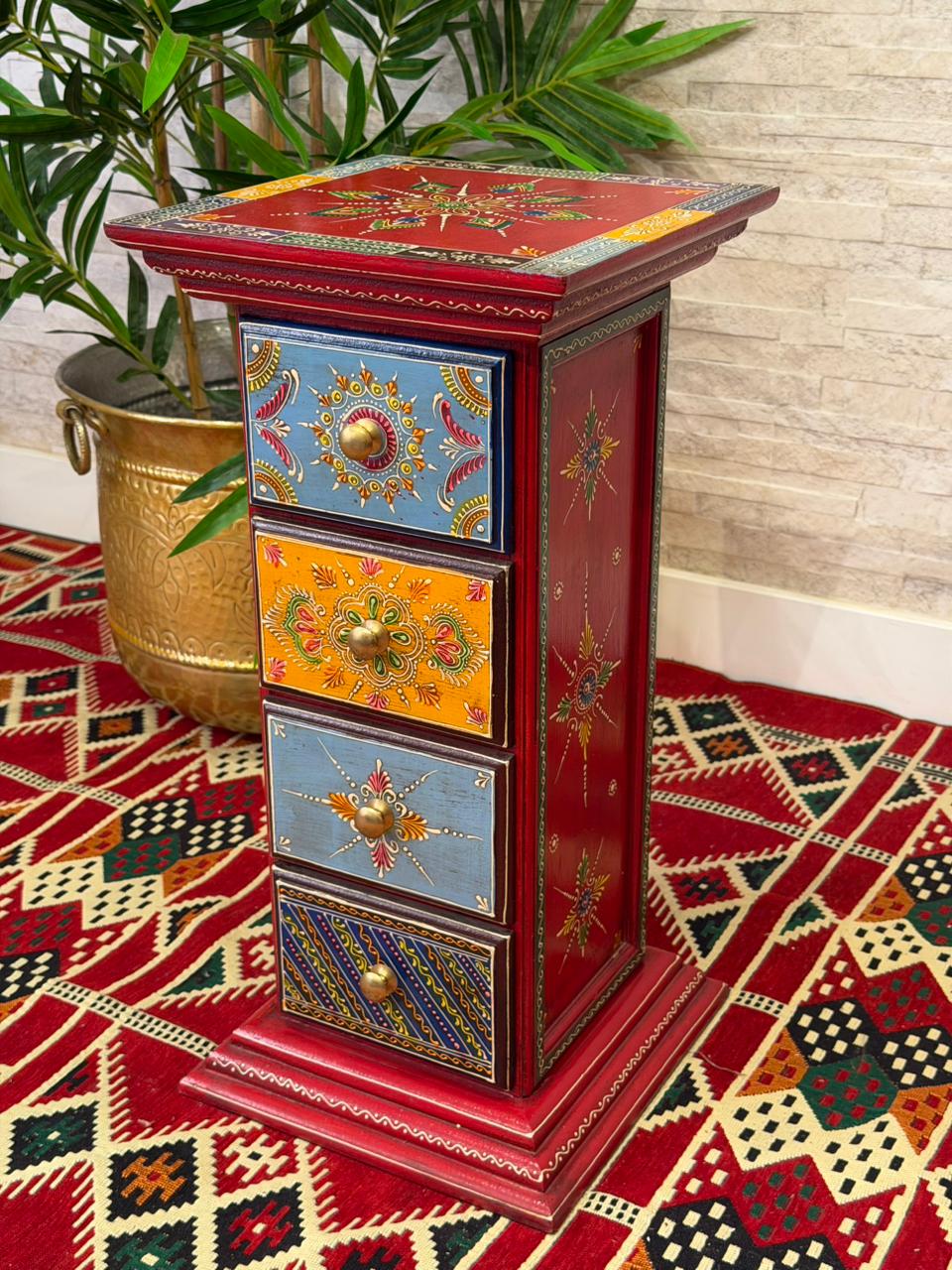 Encanto para quem ama decoração com alma. Este gaveteiro Indiano é inteiramente trabalhado em madeira e recebe delicados desenhos pintados à mão, trazendo o charme e a autenticidade do artesanato.
