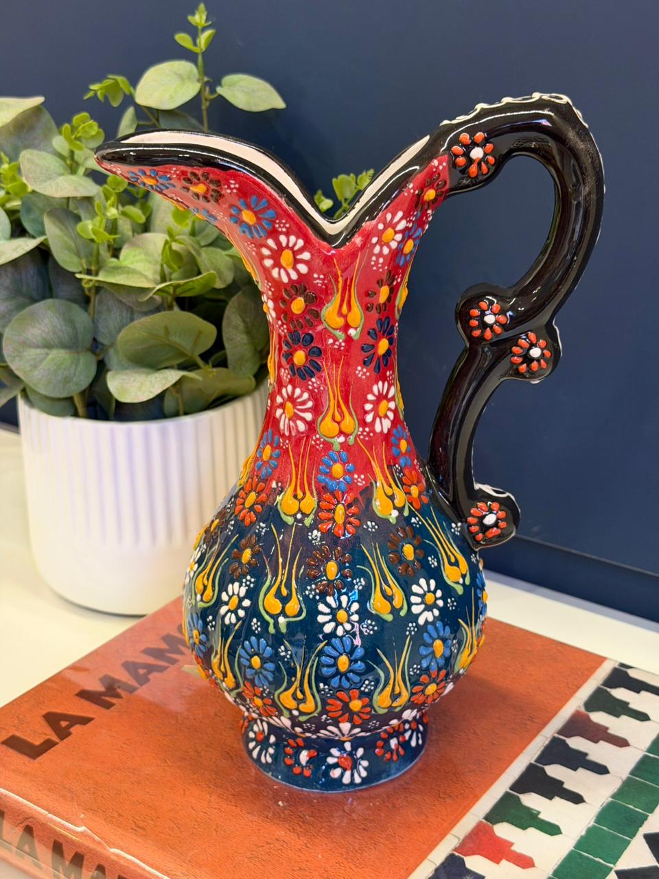 Jarra decorativa em cerâmica, pintada à mão na Turquia, com riqueza de detalhes e cores vibrantes que transformam qualquer ambiente. Seu design elegante, com alça trabalhada e bico alongado, traz um toque artístico e autêntico, valorizando a peça como destaque na decoração. Cada jarra é única, com pintura artesanal em alto relevo e acabamento refinado, perfeita para compor aparadores, mesas ou prateleiras com estilo boho e sofisticado.