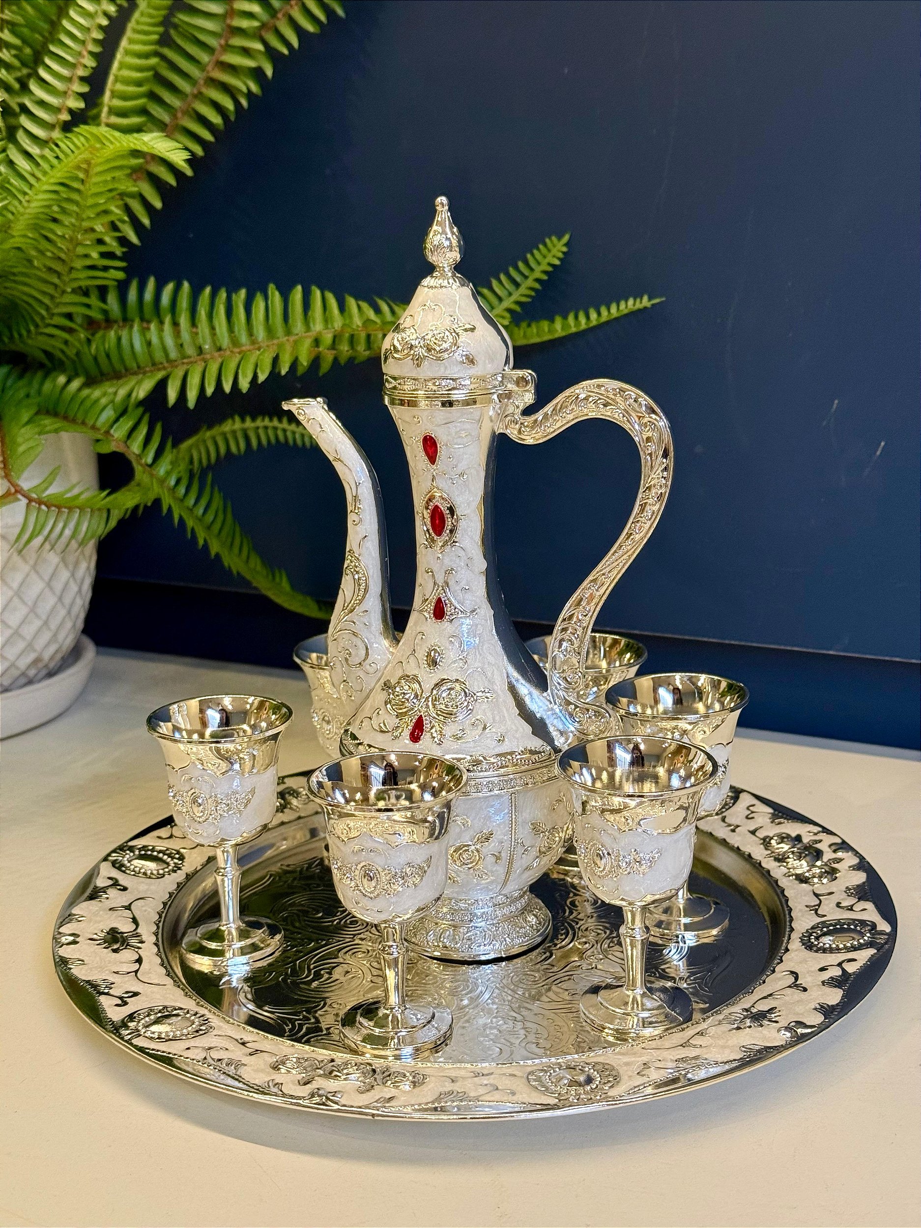 Elegância e requinte em cada detalhe. Este jogo é composto por uma belíssima garrafa ornamentada, seis taças e uma bandeja ricamente decorada, detalhes em relevo. Ideal para servir licor, chá ou café árabe, ele também é uma peça decorativa de impacto, perfeita para compor ambientes sofisticados ou temáticos.