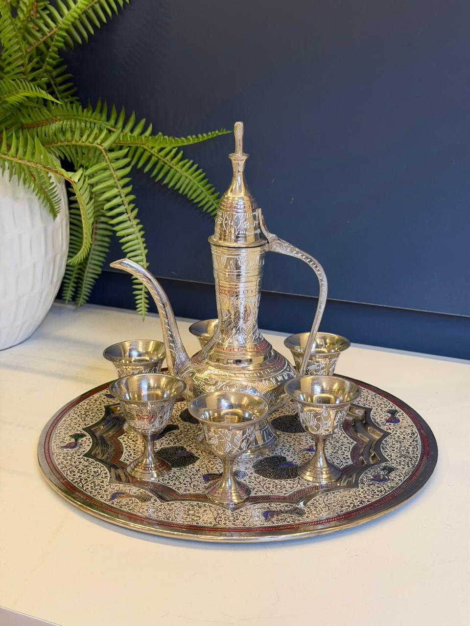 Elegância e requinte em cada detalhe. Este jogo é composto por uma belíssima garrafa ornamentada, seis taças e uma bandeja ricamente decorada, detalhes em relevo. Ideal para servir licor, chá ou café árabe, ele também é uma peça decorativa de impacto, perfeita para compor ambientes sofisticados ou temáticos.