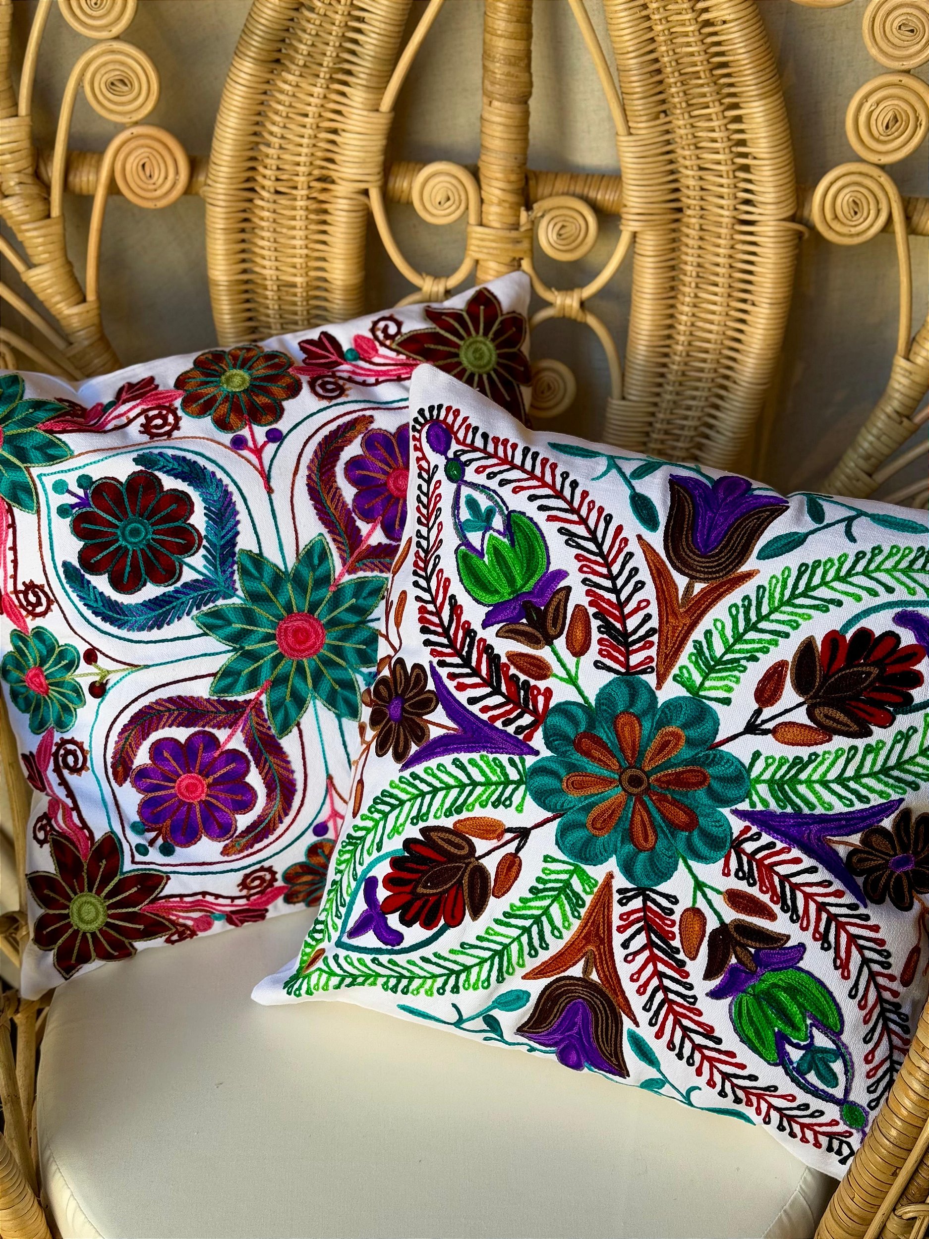 As capas de almofada são uma verdadeira peça artesanal feitas na Índia, rica em detalhes com o trabalho minusioso com bordado em brim e linhas de algodão, tornando cada peça única, com personalidade e sofisticação.