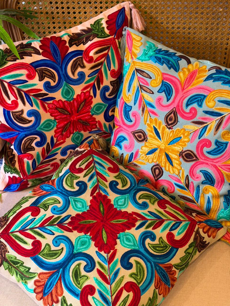 As capas de almofada são uma verdadeira peça artesanal feitas na Índia, rica em detalhes com o trabalho minusioso com bordado em brim e linhas de algodão, tornando cada peça única, com personalidade e sofisticação.