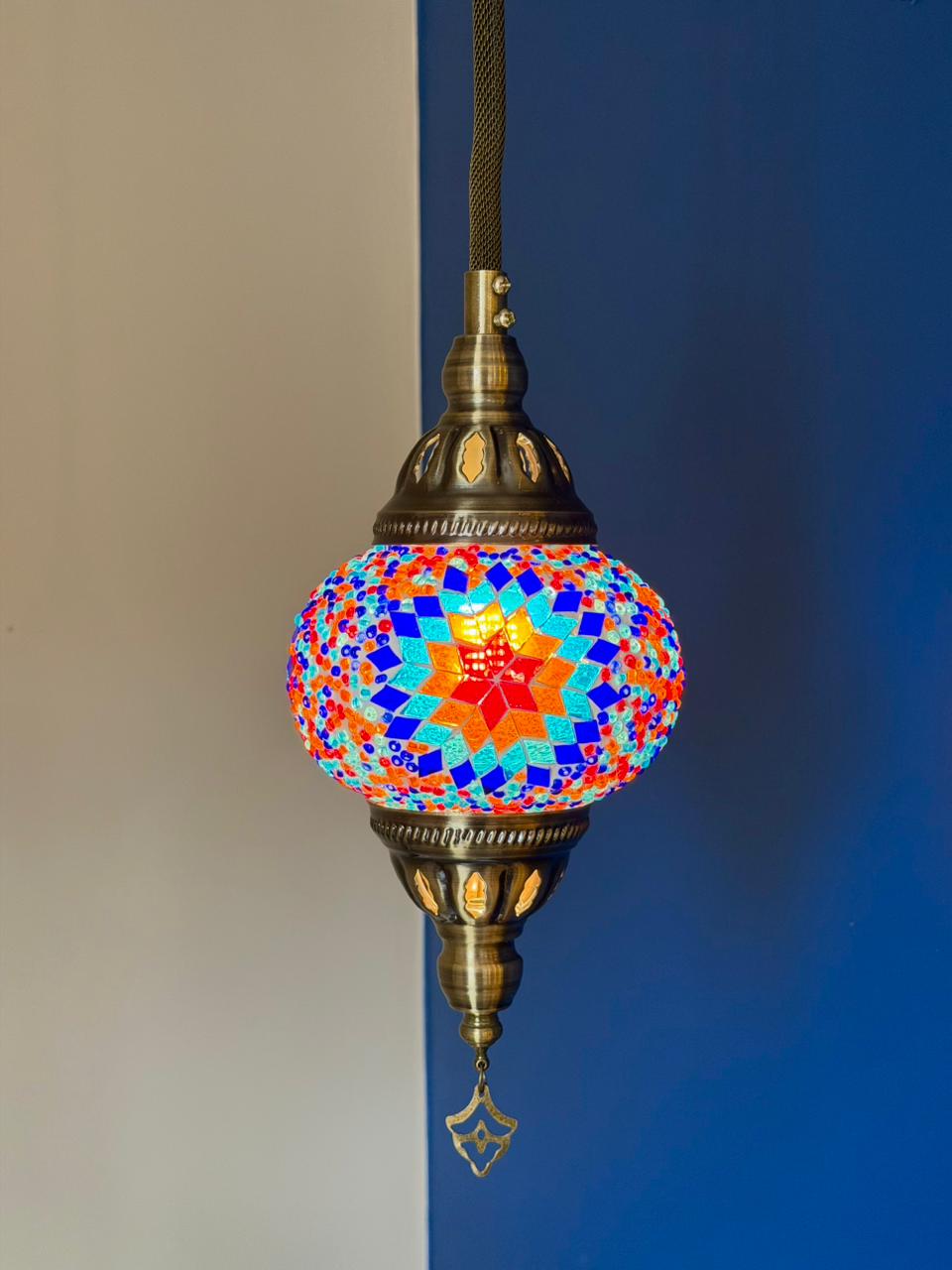As luminárias turcas são uma peça artesanal feita manualmente, que carrega tradição na arte do mosaico em vidro. Cada detalhe é cuidadosamente trabalhado à mão, formando um desenho vibrante e harmônico, com pequenas pastilhas coloridas que criam um efeito luminoso único e acolhedor.